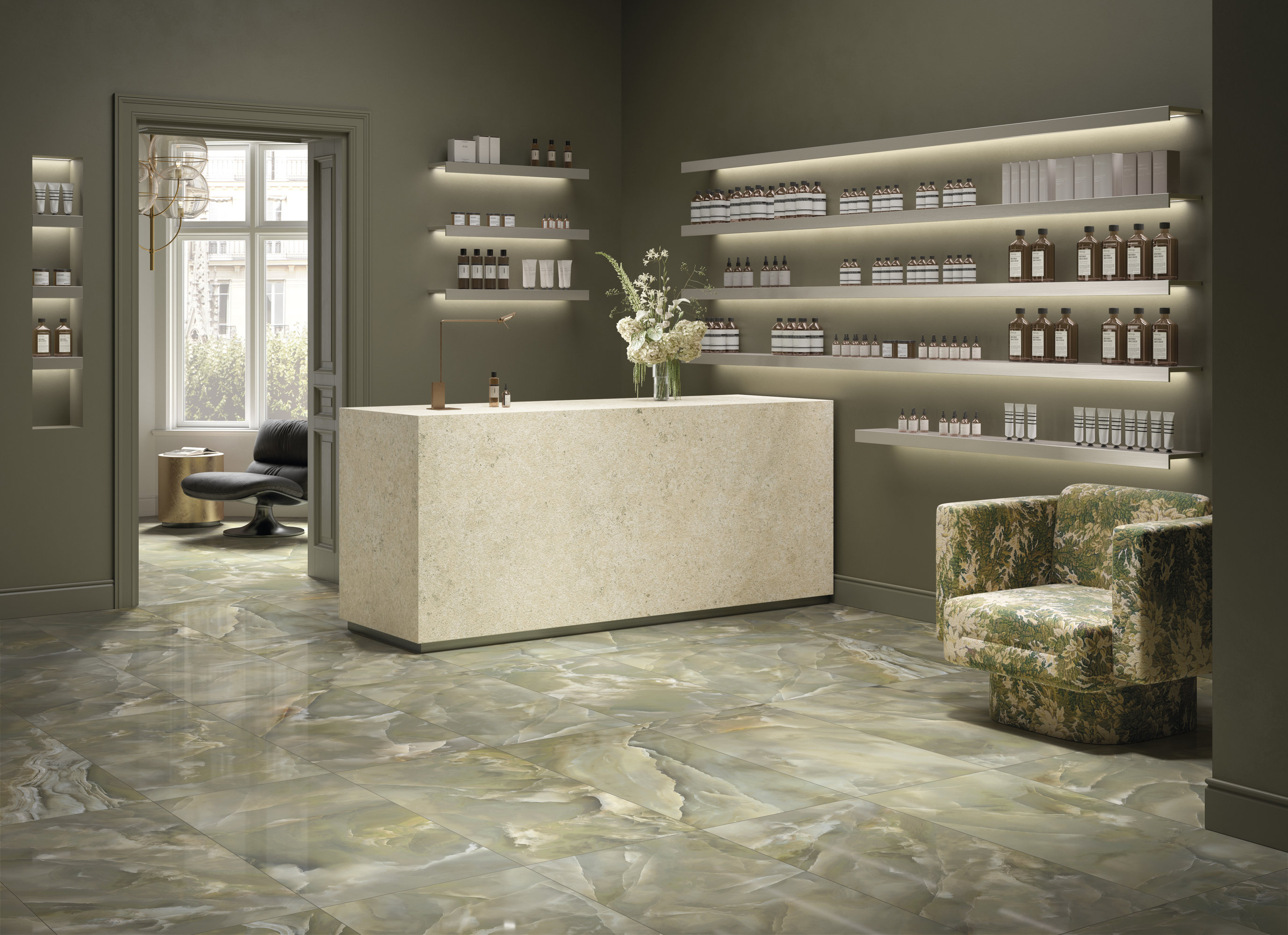 The Onice Giada line in gres porcellanato stands out for its aesthetics, innovation and design applications. Insuperable beauties An extensive collection of marble and stone, reinterpreted in the finest porcelain stoneware. An elegant design, deep tones a