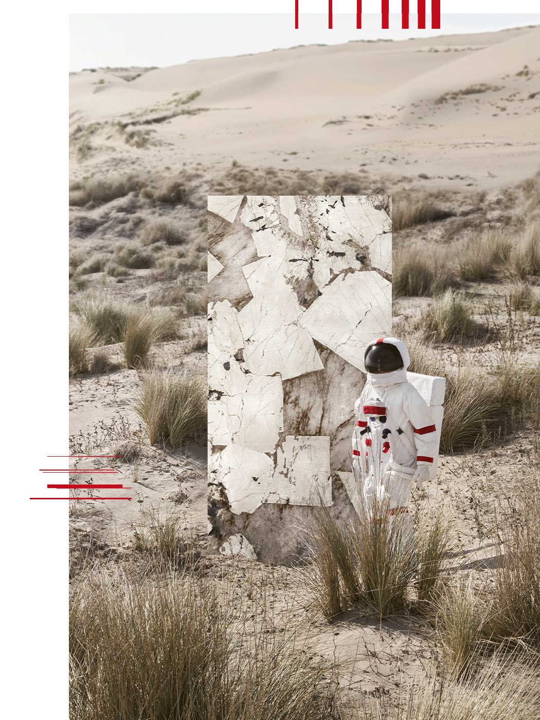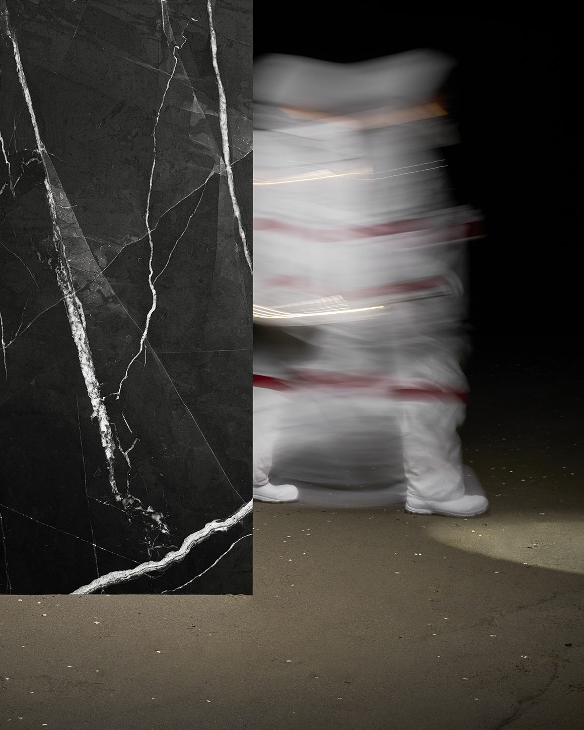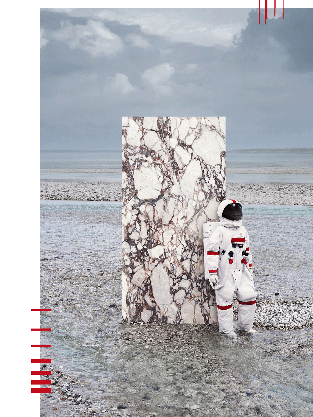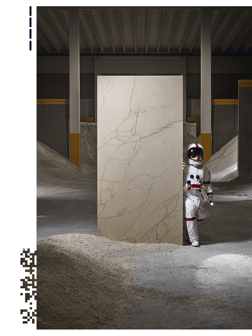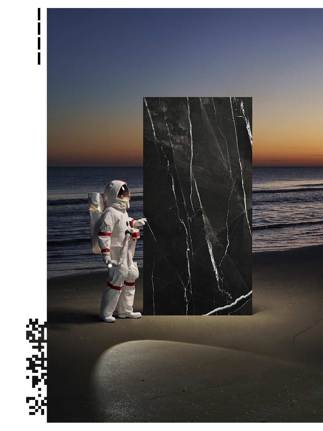 “The mystery of discovery is my guide on my slow night walk. This is where it all begins, in the research phase, when every step is like stepping into the unknown. The sand is cold, the wind whispers. I suddenly see a reflection in the darkness: Calacatta Black MaxFine. I examine it closely: deep black, with precious light-colored veins. This is nature speaking to me, revealing its hidden beauty. Each new discovery is a change, and the journey continues.”