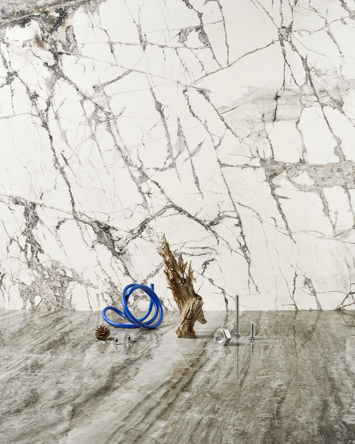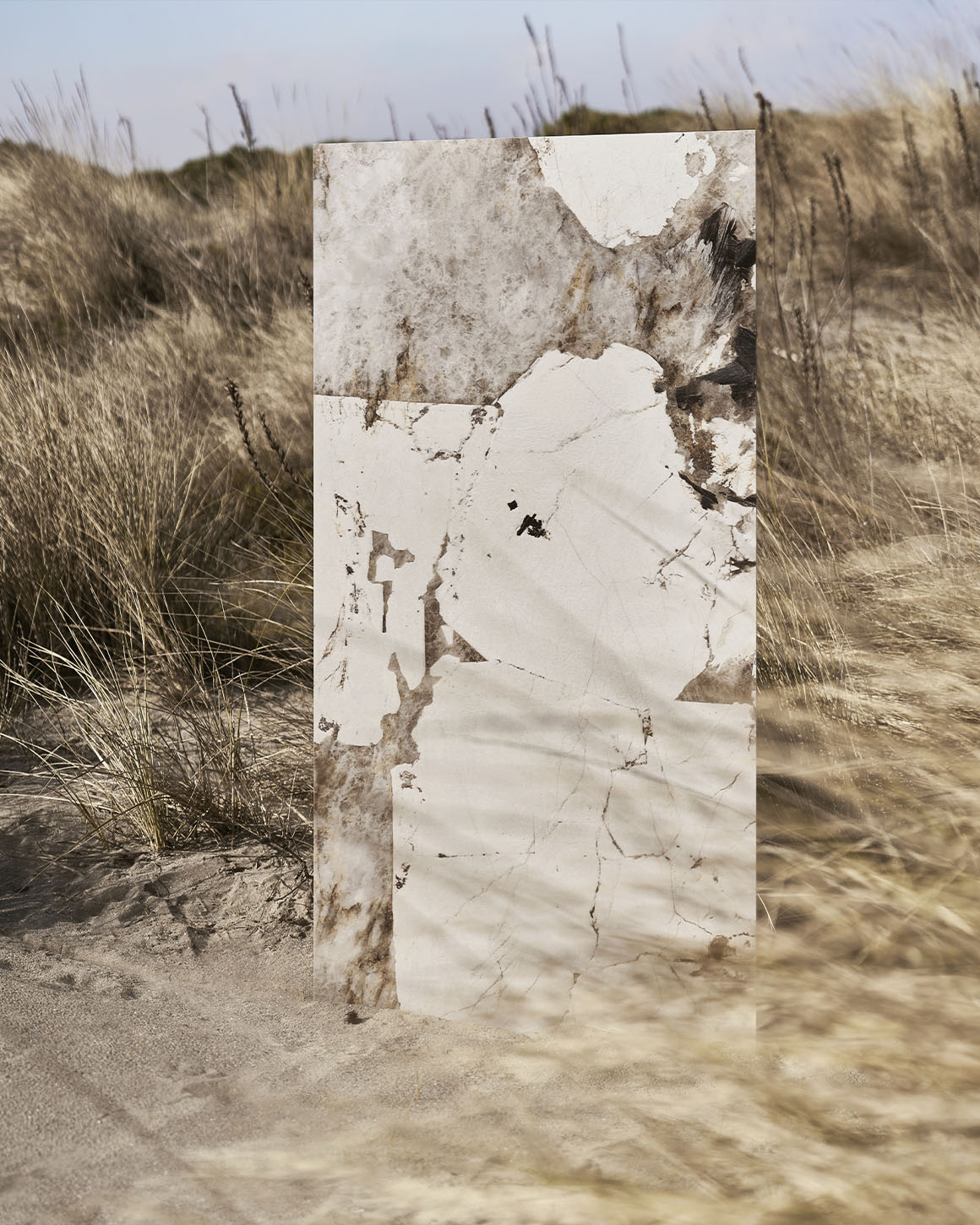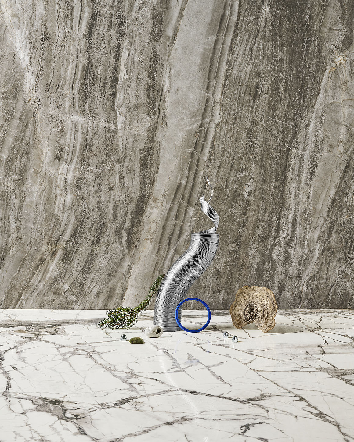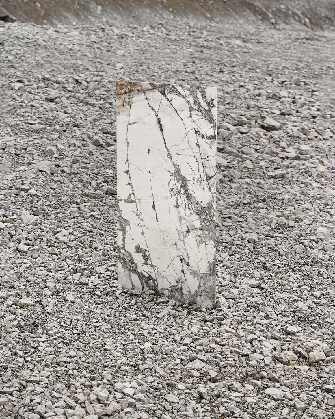 A stretch of rocks carved by gentle, but constant, wind. A rough, barren, but not inhospitable landscape. The sky appears to reflect the grey hues of stone, the soil is stirred by the animals that live in it. The explorer discovers Calacatta Grey Maxfine, a blue-gray monolith that towers over the horizon, an exquisite and precious material.