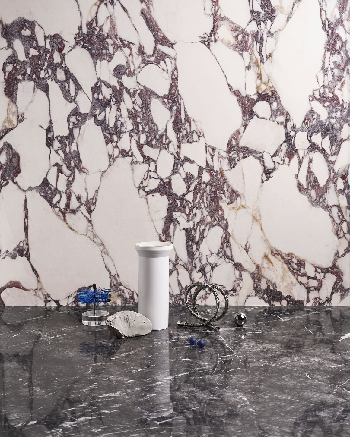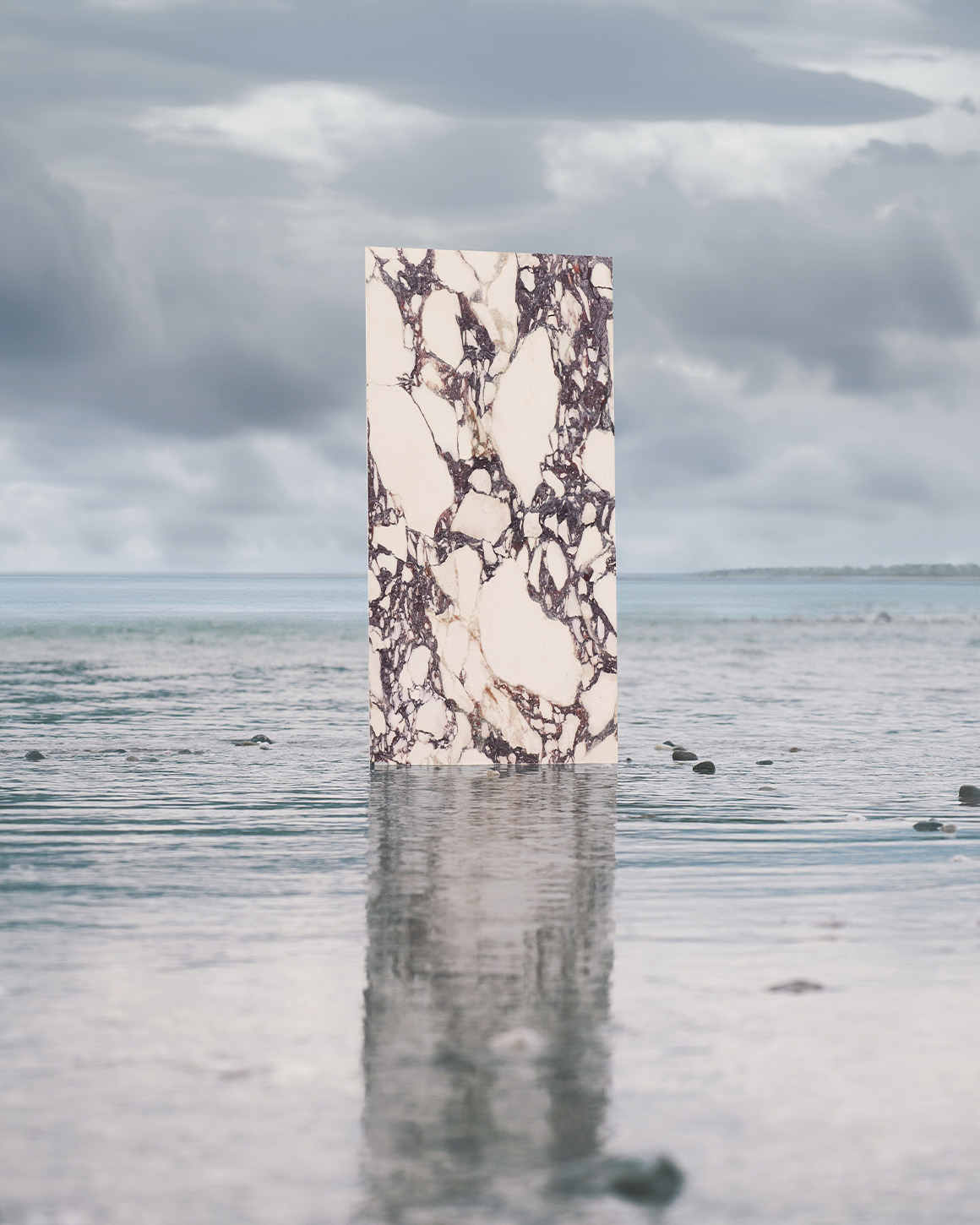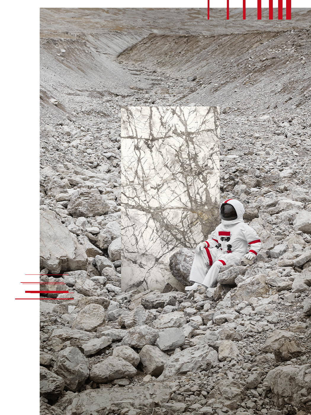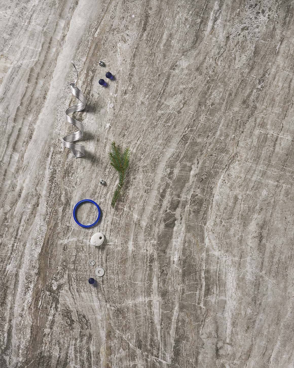 A stretch of rocks carved by gentle, but constant, wind. A rough, barren, but not inhospitable landscape. The sky appears to reflect the grey hues of stone, the soil is stirred by the animals that live in it. The explorer discovers Calacatta Grey Maxfine, a blue-gray monolith that towers over the horizon, an exquisite and precious material.
