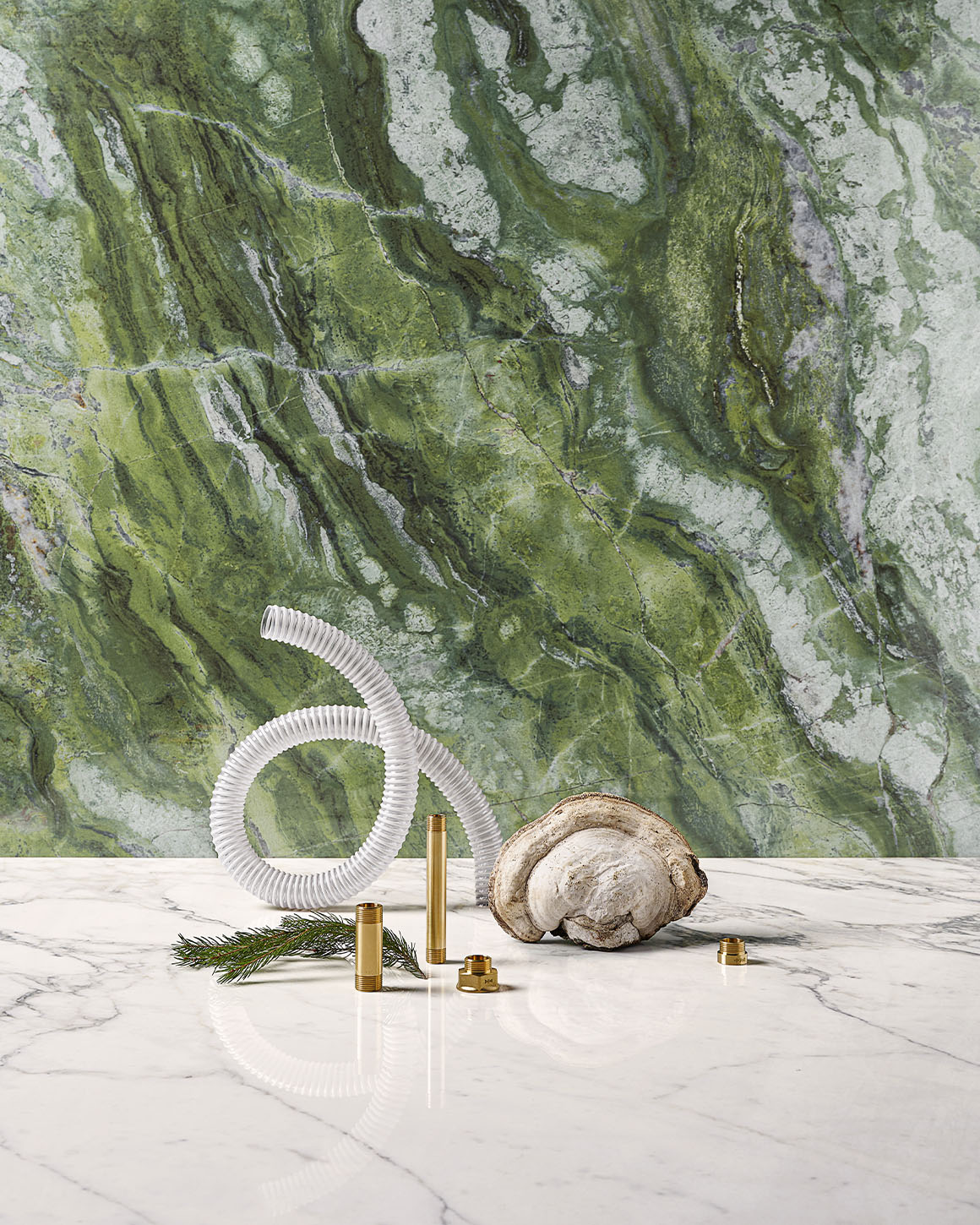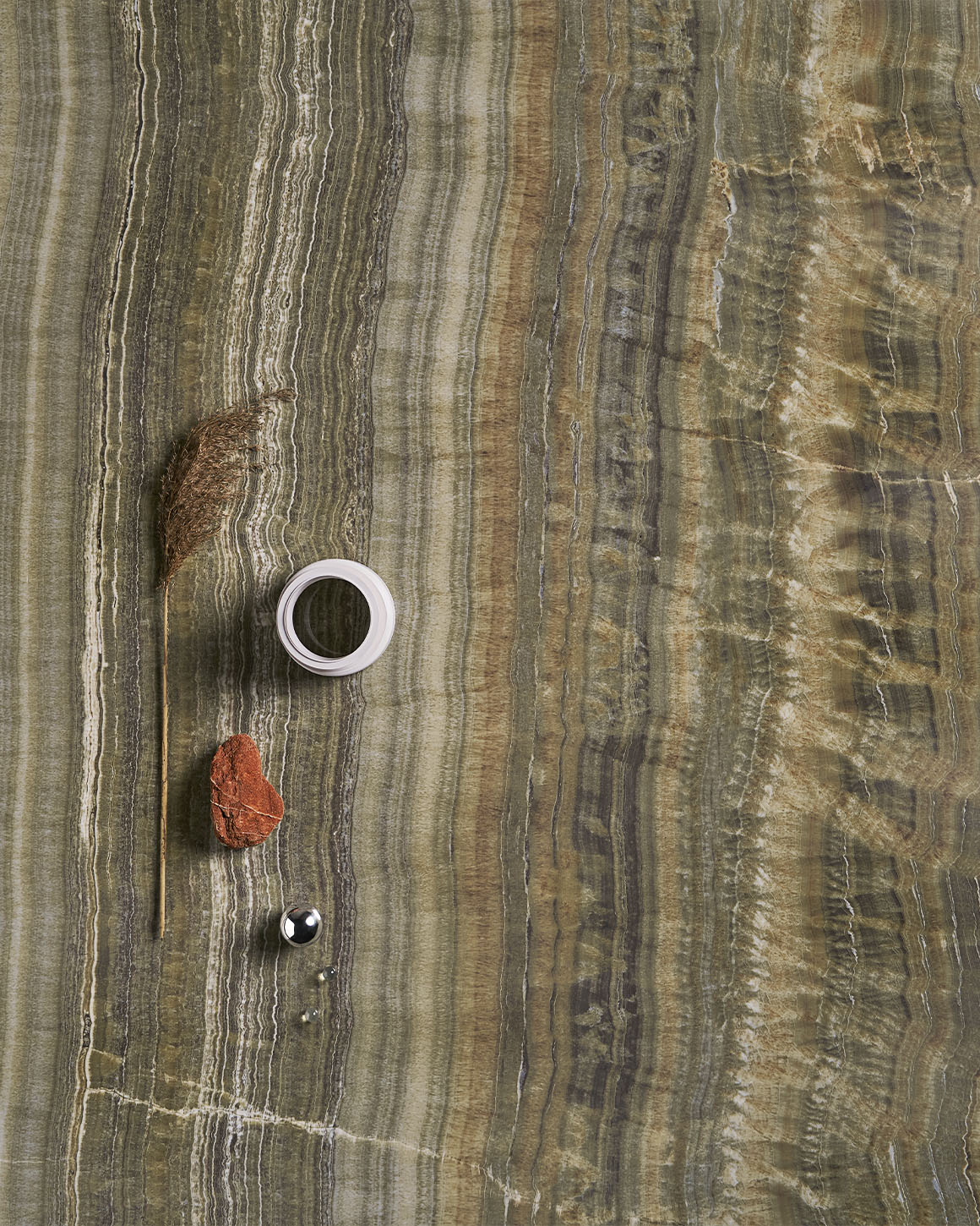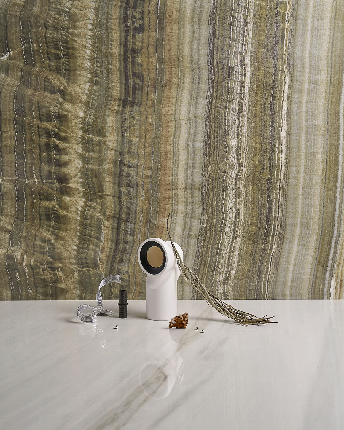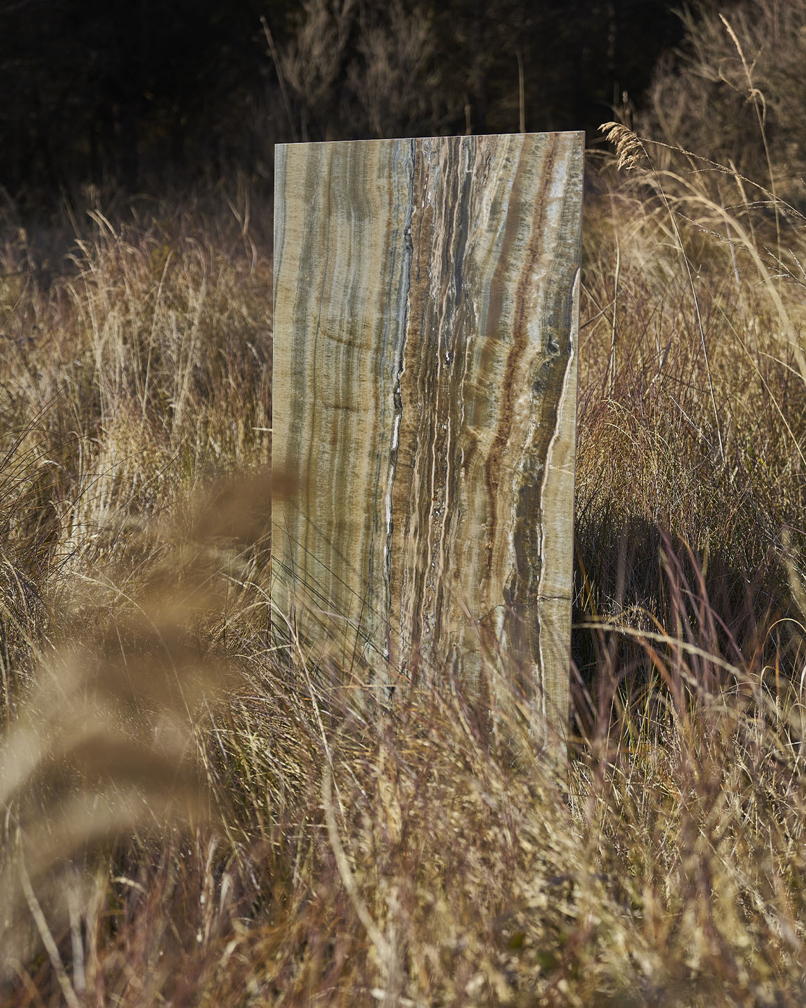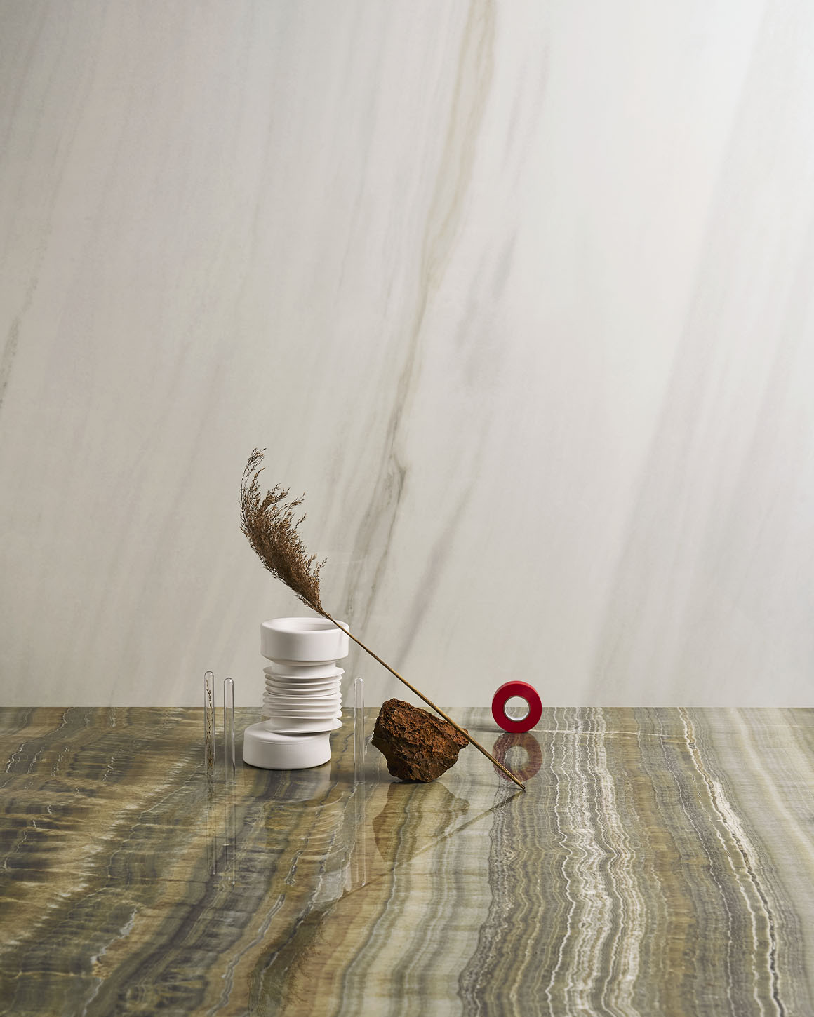 Under a clear blue sky, where clouds merge to cast light and shadow, a lush green blanket spreads out, dotted with stems that sway gracefully to the rhythm of the wind. A tranquil oasis in which silence is broken only by the sounds of birds singing and leaves rustling. In this unspoilt Garden of Eden, a precious gem appears on the horizon: Onice Verde Maxfine. Its sage green veins blend with the natural surroundings, creating a harmonious interplay of shapes and colours.