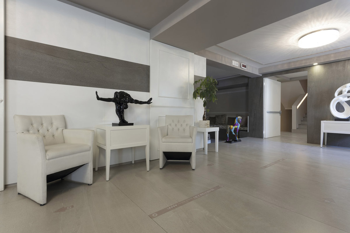 The surfaces by FMG were selected not only because of their aesthetic appeal and stylishness, but also because of the quality of the porcelain stoneware they are made of. They are extremely resistant to mechanical stress and chemical attacks, non-absorbent, and easy to clean and sanitize, which makes them ideal for common areas subject to stress and wear and tear. With their 6 mm thickness, they are not only easy to lay and handle, but are also practical, functional, and retain their properties over time.
