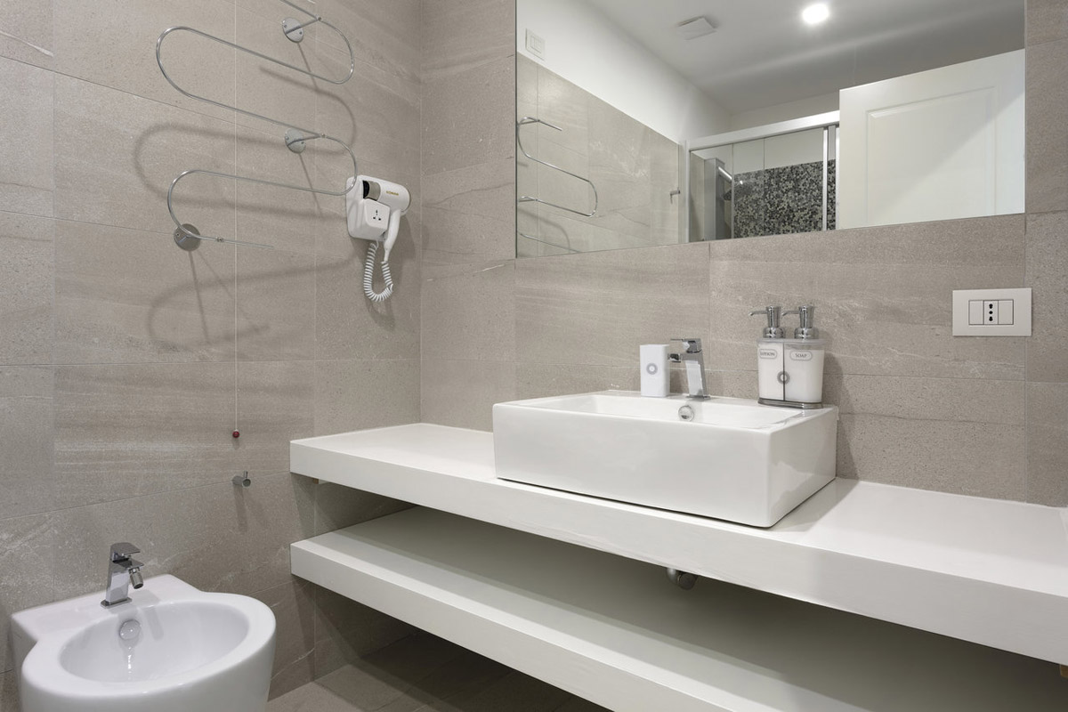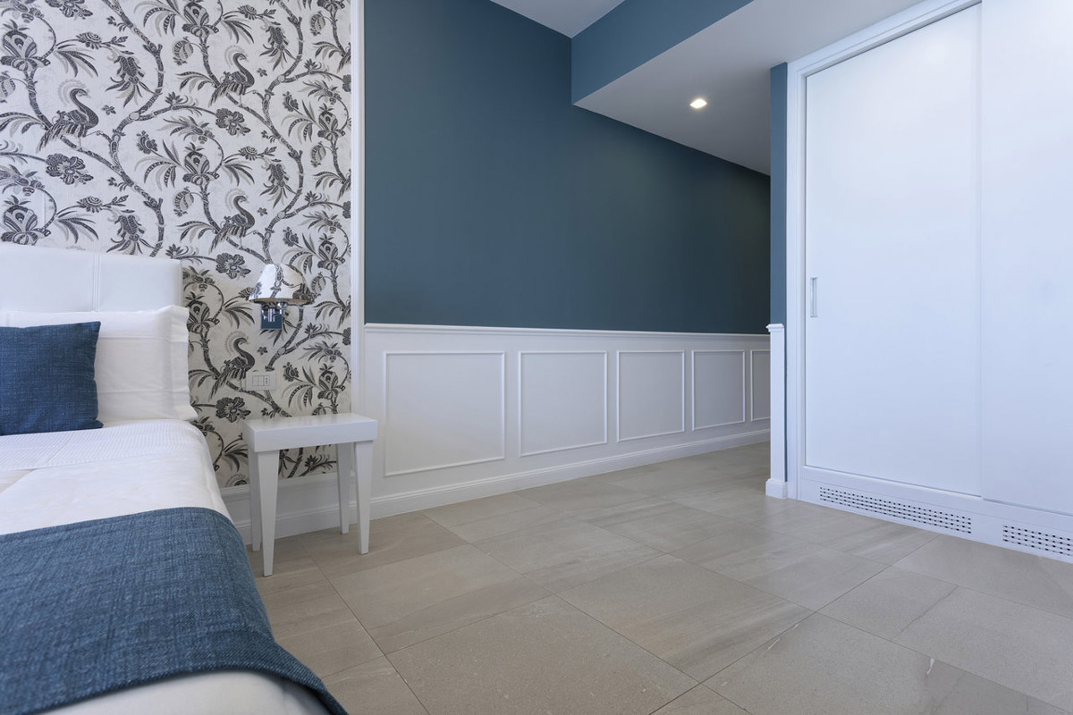 For this hotel, nestled between the sea, the cliffs and the inland area, with its characteristic olive groves and vines, the architect designed fittings with natural effects and neutral hues, which perfectly complement the surrounding landscape. In keeping with this choice, the MaxFine Pietra Lavica surface by FMG, which is a reinterpretation of volcanic rock with the addition of a contemporary twist, was chosen for the ceramic tiling of the interior.