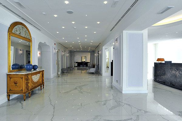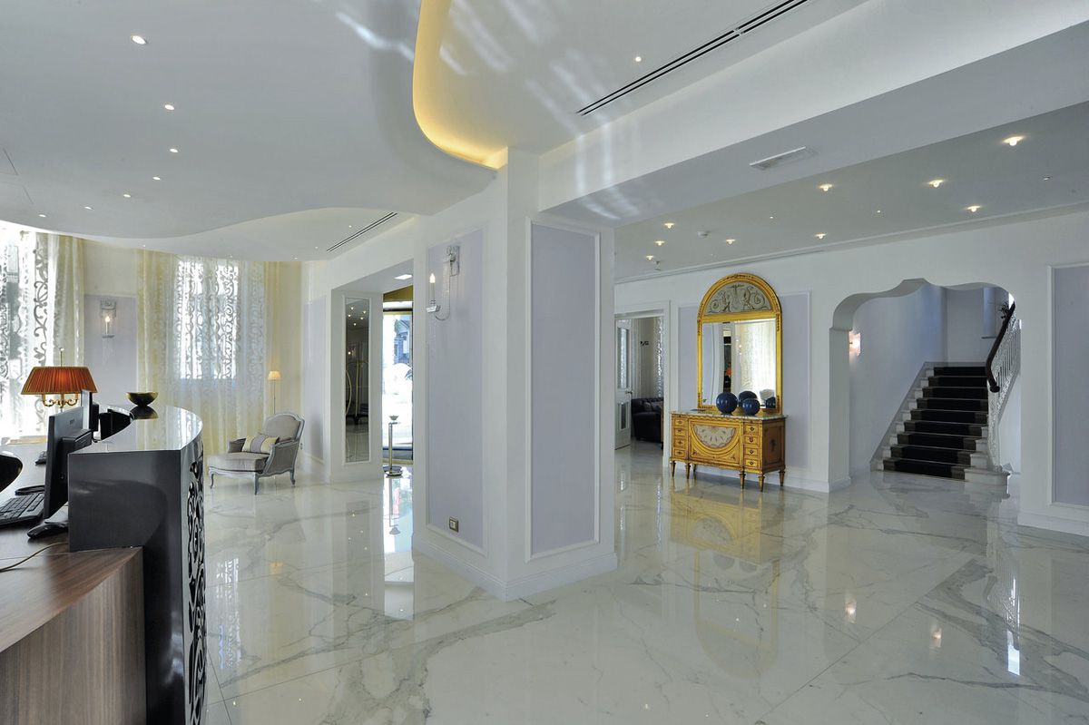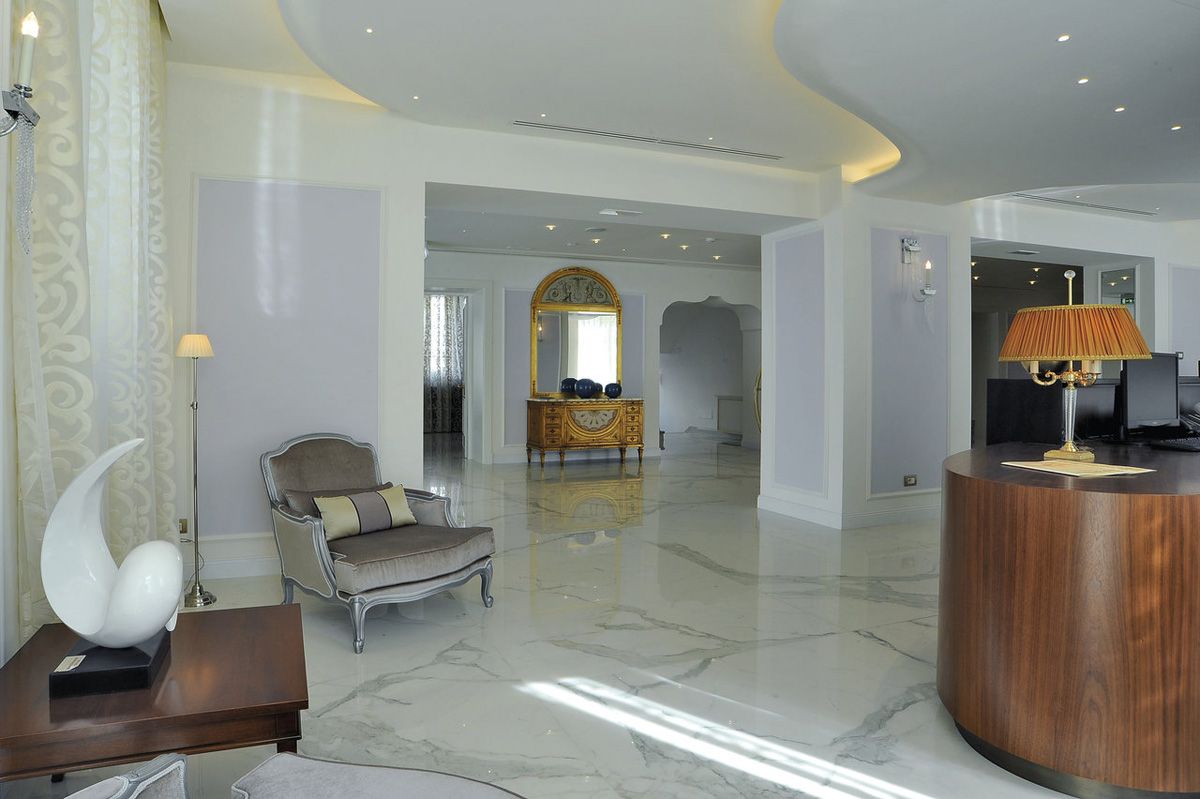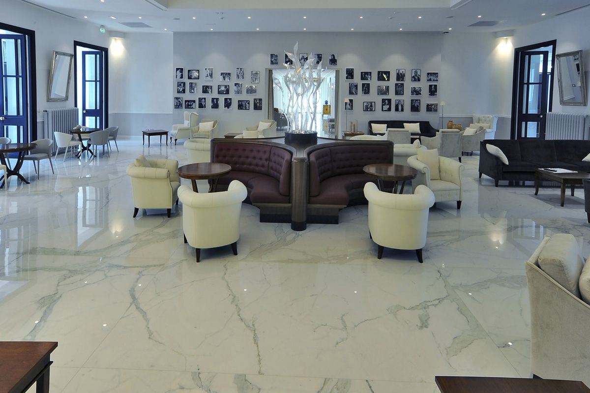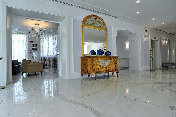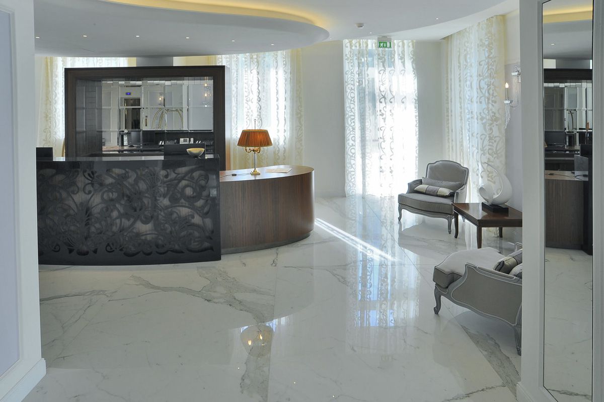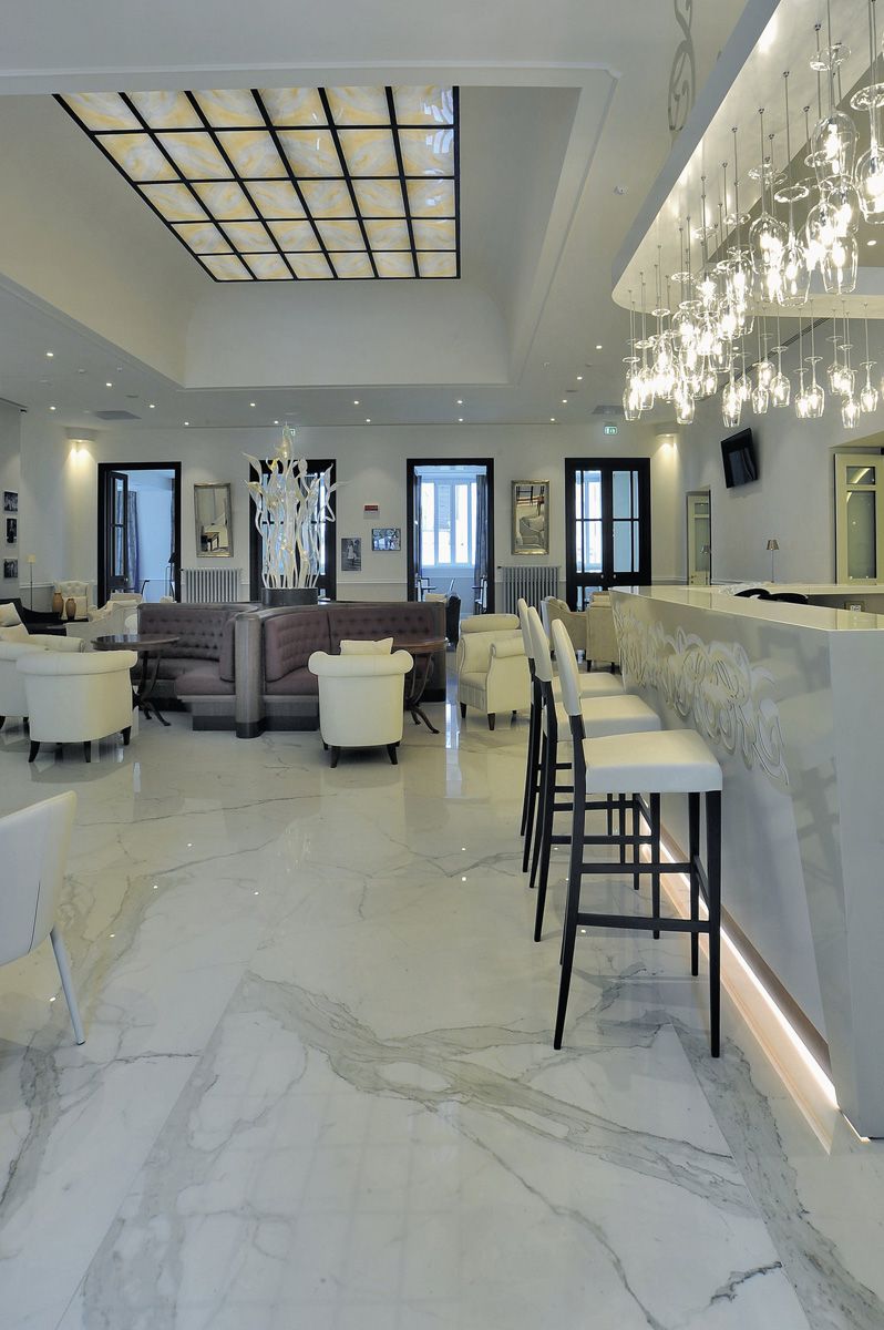 Marmi Calacatta and Onici Oro cover the walls and floors of the five-star Grand Hotel in Salsomaggiore, in the province of Parma, a member of the Italian Uappala Hotels Group.