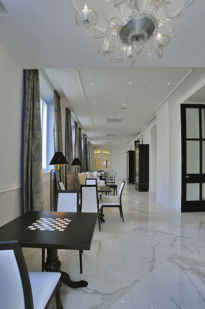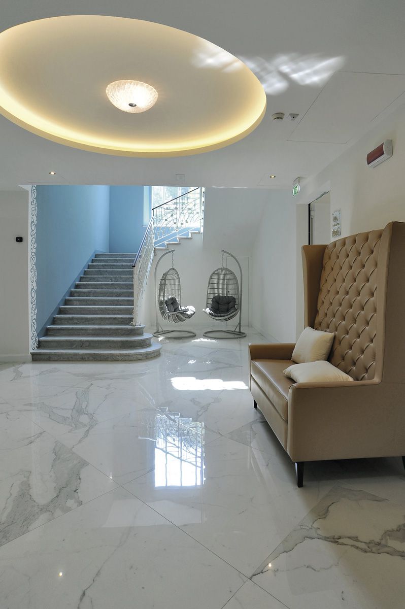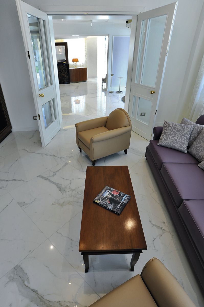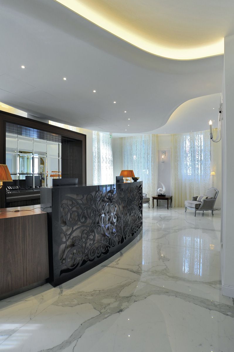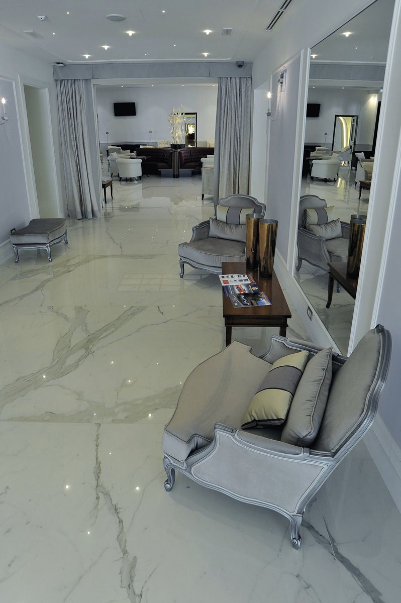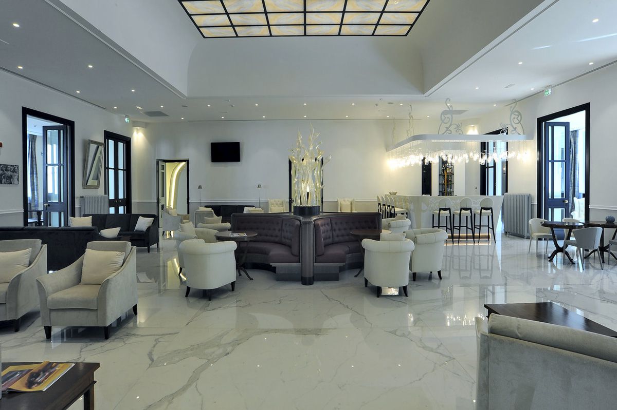 Marmi Calacatta and Onici Oro cover the walls and floors of the five-star Grand Hotel in Salsomaggiore, in the province of Parma, a member of the Italian Uappala Hotels Group.