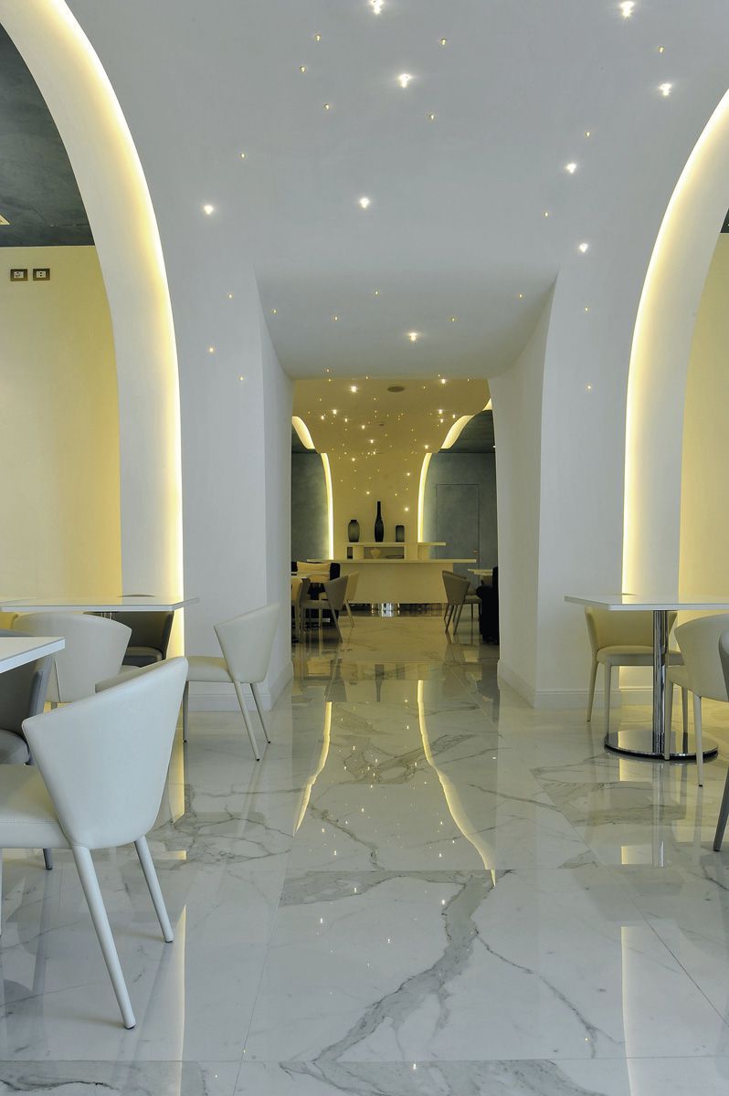 The choice of FMG Fabbrica Marmi e Graniti’s Marmi Calacatta and Onici Oro surfaces perfectly suits the brand’s mood of prestige and luxury, while fitting into the traditions of Italy and reinterpreting them in a new light.