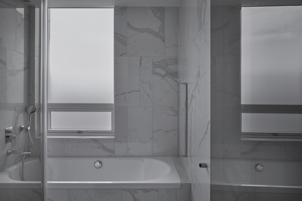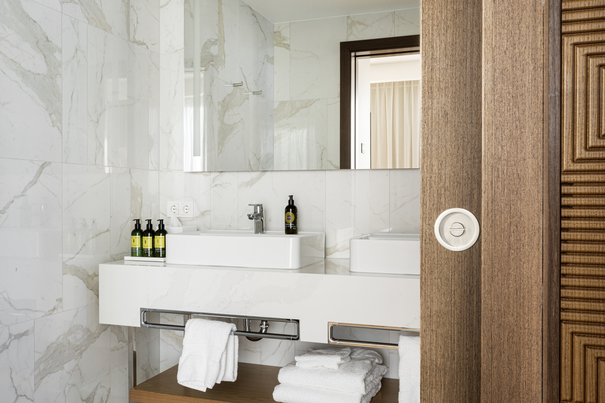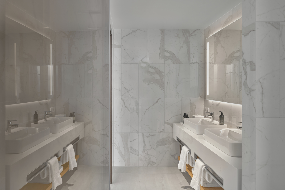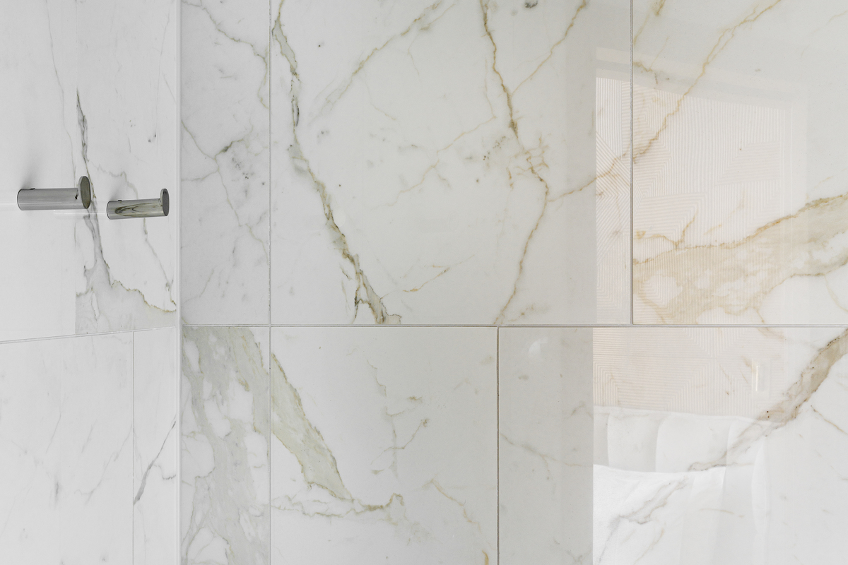 On the top floors of the Iceland Telecom, the guest bedrooms have spacious en-suite bathrooms featuring Marmi MaxFine White Calacatta, which, with its elegant brightness and delicate texture, is used as a wall covering and as a shower and bathtub cladding.