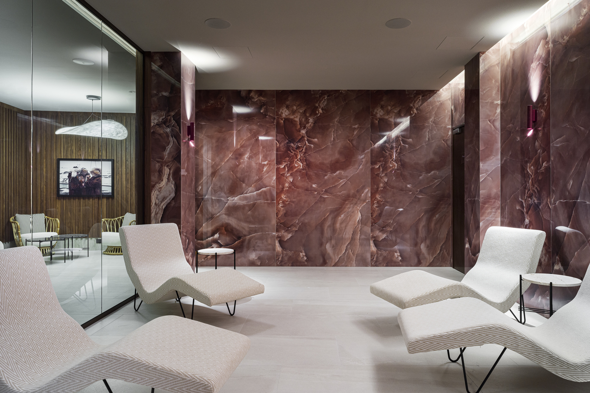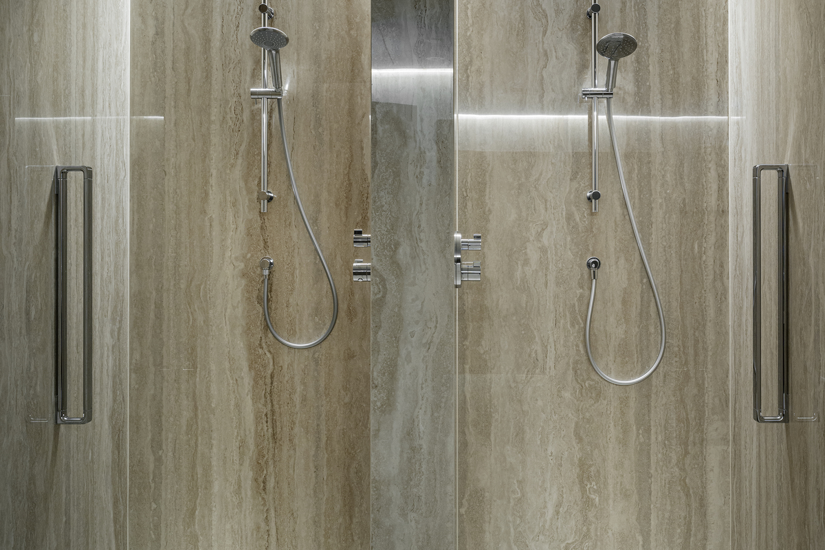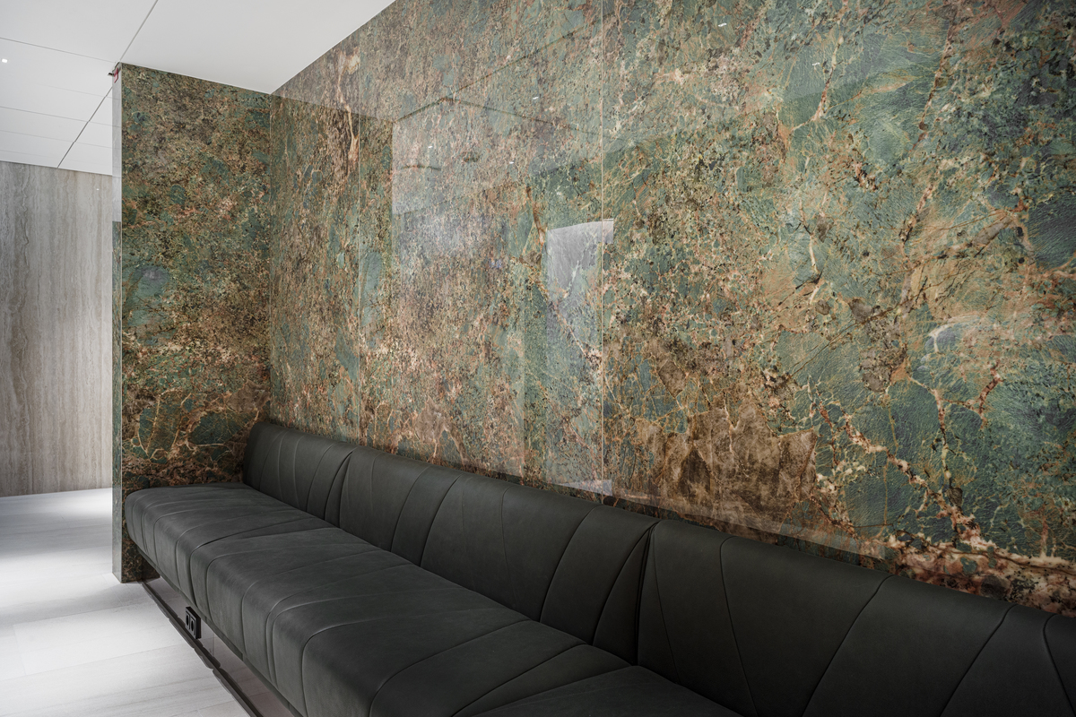 Located on the lower level is a luxurious spa, including thermal baths, a sauna and steam baths, plus massage and wellness treatment rooms, which features Quarzite by FMG. Due to its low reflectivity and non-slip finish, it not only makes for an intimate and cozy ambience, but also offers comfort and functionality. MaxFine panels are applied to the walls, taking center stage: made using cutting-edge technology, they have a continuous surface and, with their large formats, offer an unparalleled seamless design. The chosen textures have a classical style, with marble and stone imitations that create exclusive, magnificent and refined settings. The panels, which were pre-cut to customized specifications in order to create different patterns, made it possible to achieve a very attractive end result and to significantly reduce waste from scrap, which is an important aspect on major construction sites.