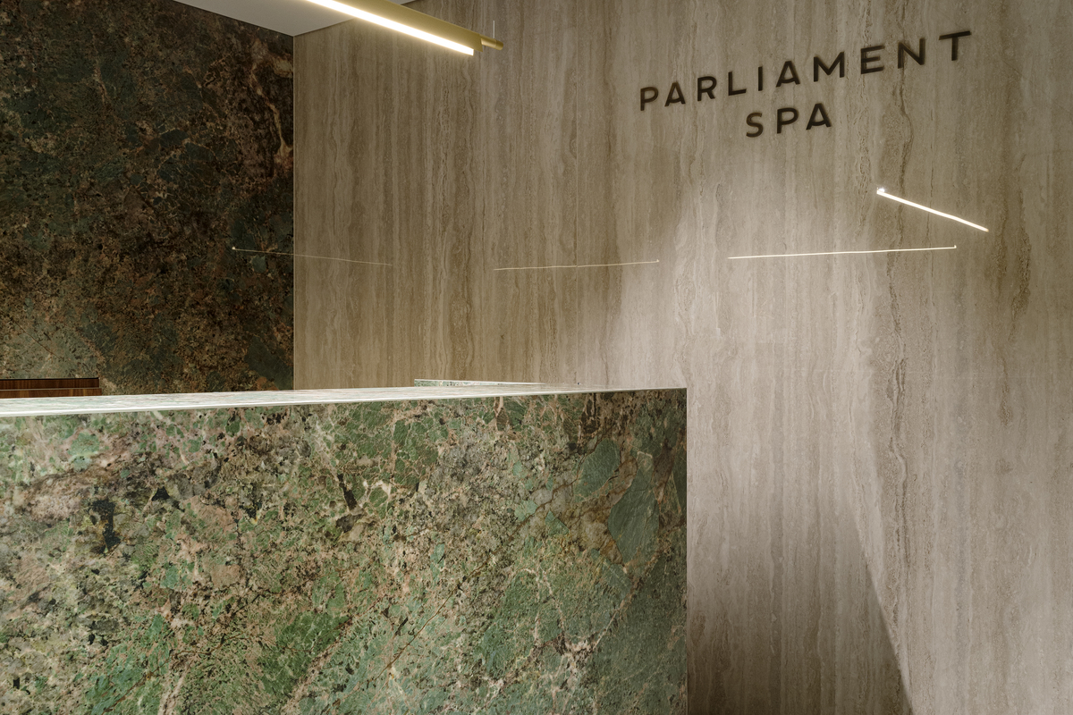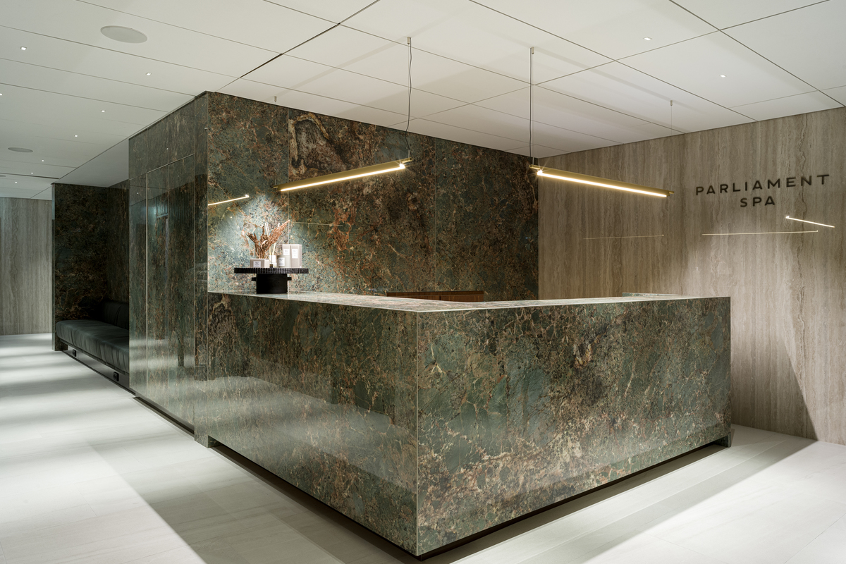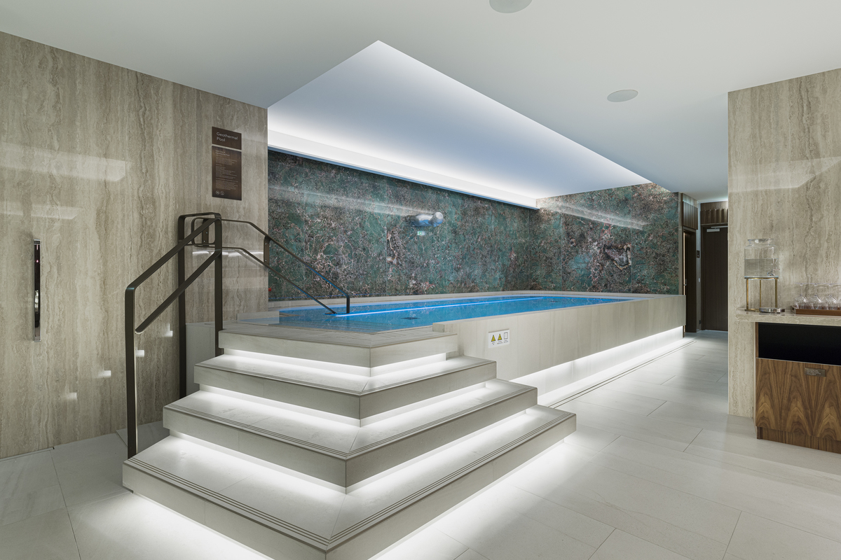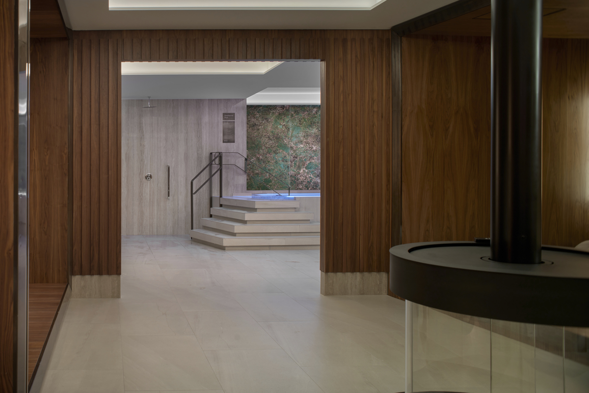 Located on the lower level is a luxurious spa, including thermal baths, a sauna and steam baths, plus massage and wellness treatment rooms, which features Quarzite by FMG. Due to its low reflectivity and non-slip finish, it not only makes for an intimate and cozy ambience, but also offers comfort and functionality. MaxFine panels are applied to the walls, taking center stage: made using cutting-edge technology, they have a continuous surface and, with their large formats, offer an unparalleled seamless design. The chosen textures have a classical style, with marble and stone imitations that create exclusive, magnificent and refined settings. The panels, which were pre-cut to customized specifications in order to create different patterns, made it possible to achieve a very attractive end result and to significantly reduce waste from scrap, which is an important aspect on major construction sites.