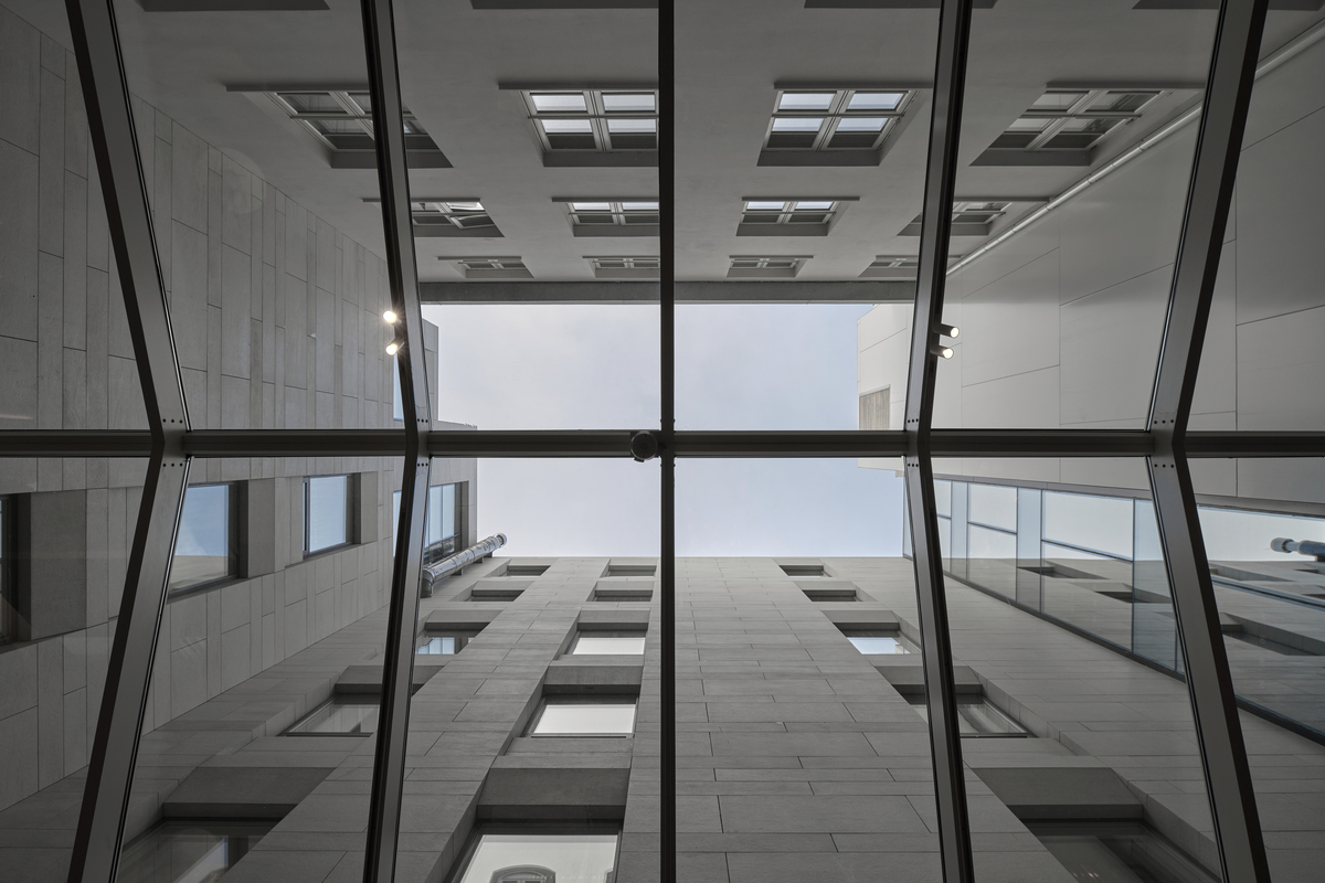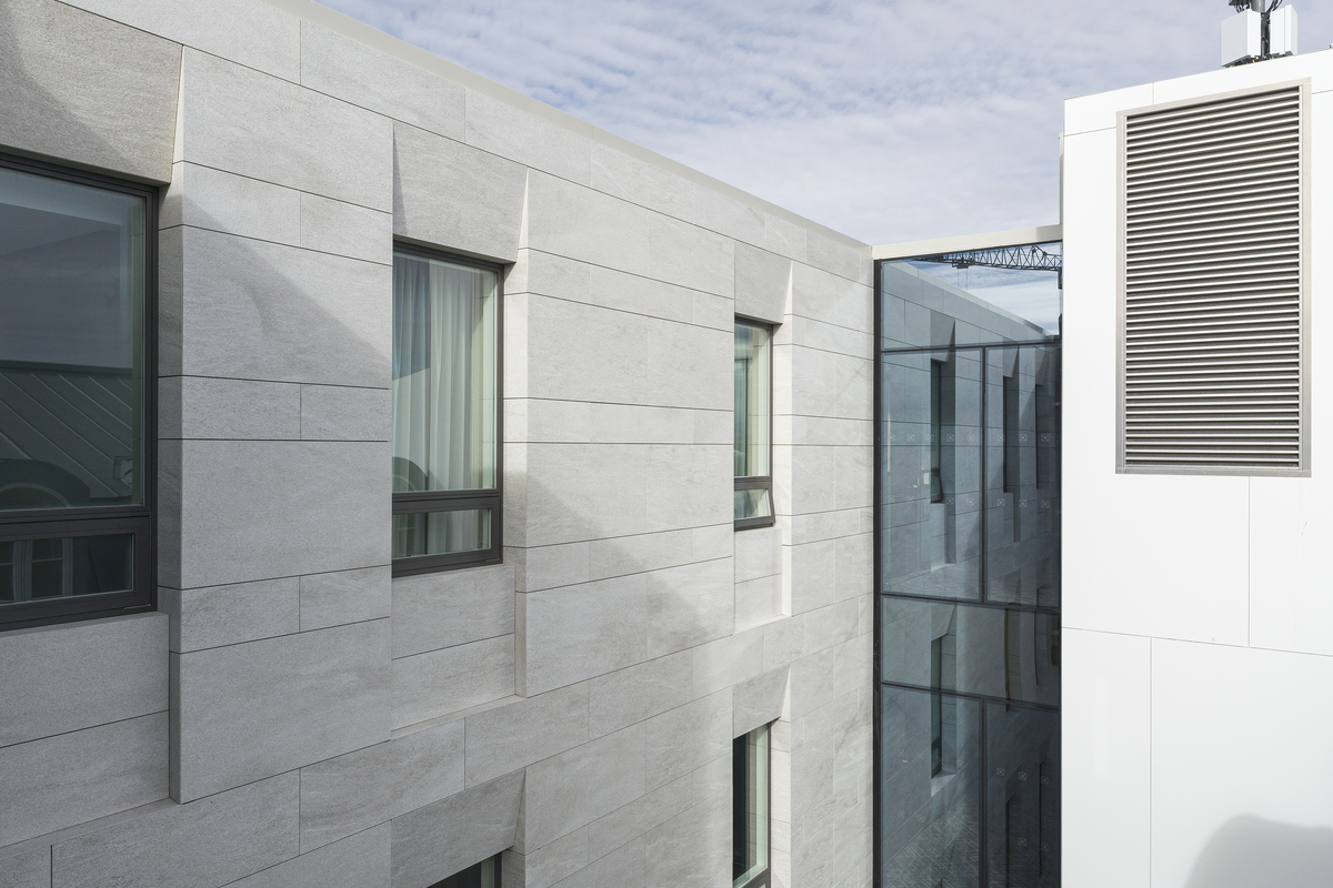 From a stylistic perspective, the exteriors are clearly inspired by the city center’s architecture, which traditionally includes relatively small, low-rise buildings of different colors with sloping roofs. FMG Quarzite in the color Ghiaccio was chosen for the building envelope of some of the new parts of the hotel. With its natural-looking stone effect, blends in perfectly with the surrounding materials, including reinforced concrete, diorite in the historic buildings, and the metal ventilated façade.