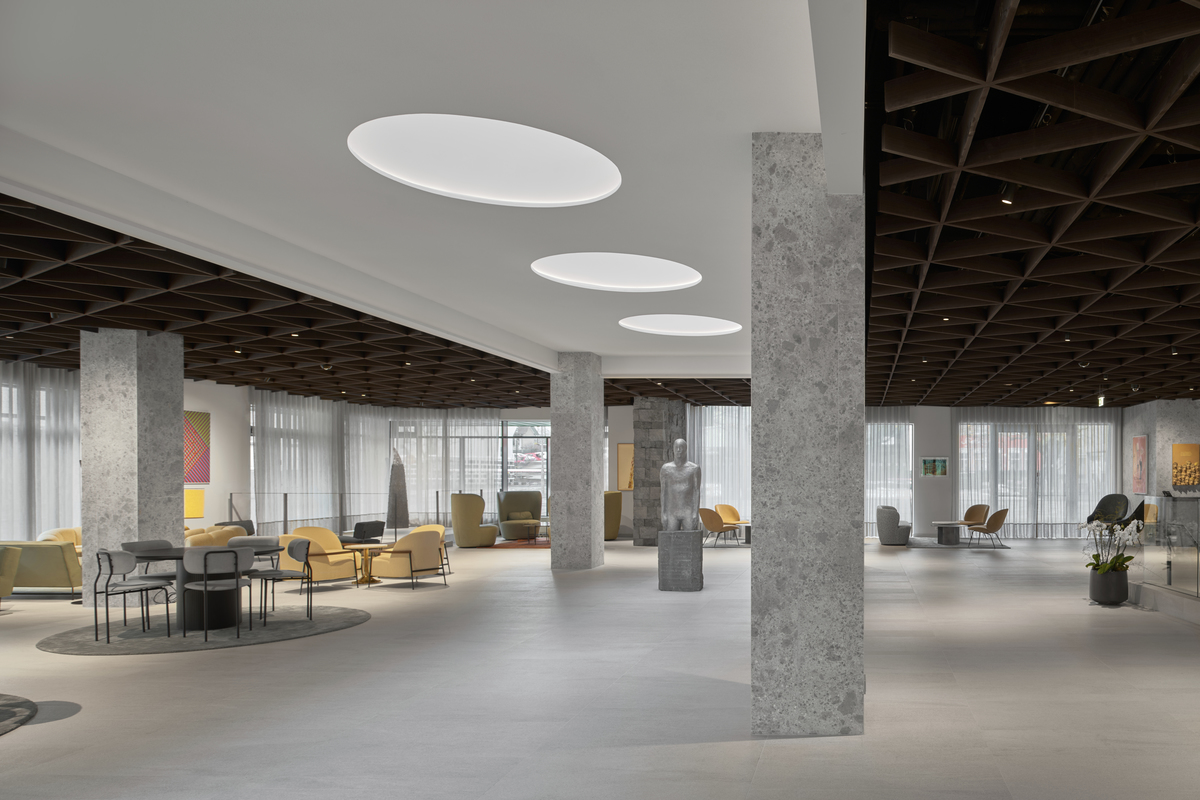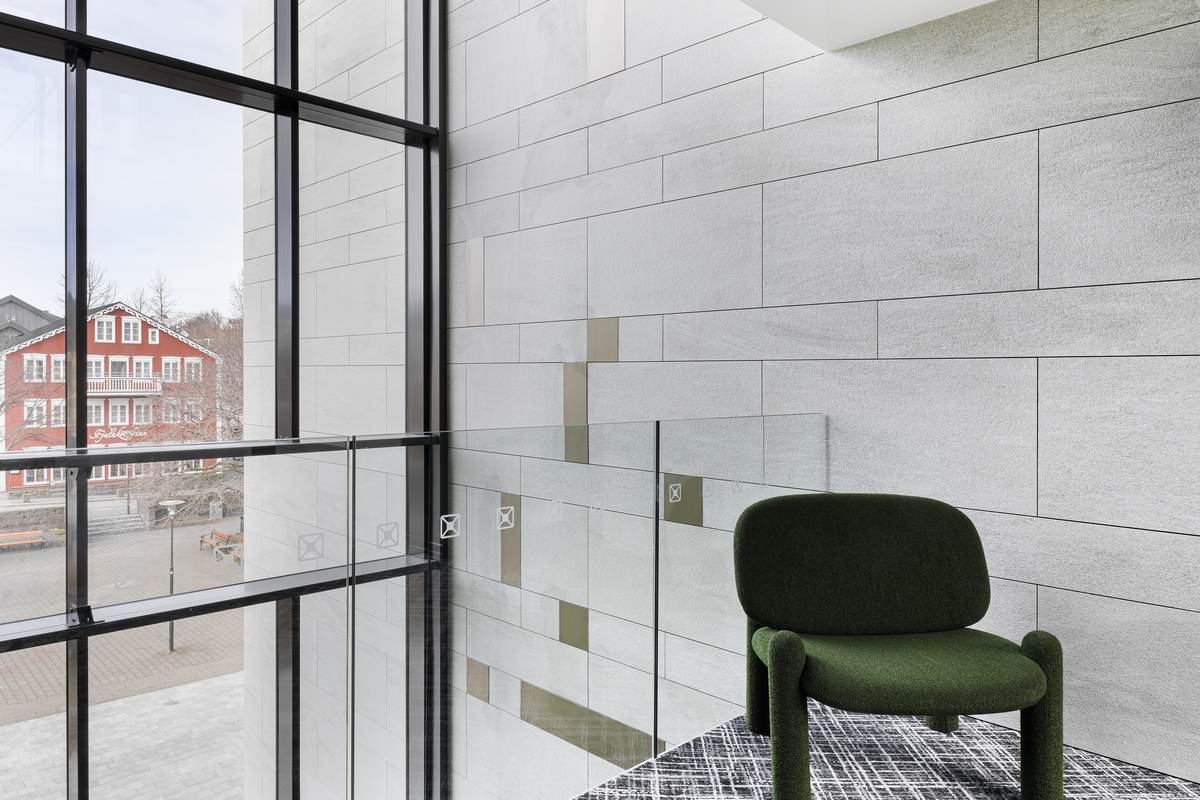 Today, on the first floor of the Iceland Telecom building – the telecommunications headquarters – there is a very stylish bar and a restaurant with an old-world ambience, where guests can marvel at the kitchen island, with its sleek, geometric shapes, clad with MaxFine Connemarble Irish. With an area of more than 500 square meters comprising new and pre-existing sections, this space is intended to offer an experiential journey with just a few places to walk through: it is open to the public and equipped to host events, exhibitions and installations. The use of the FMG Quarzite porcelain stoneware collection, with its velvety look and neutral shades, used for the floor in the gallery, which is accessible to the public, and on the large staircase, gives it a cozy and bright atmosphere.