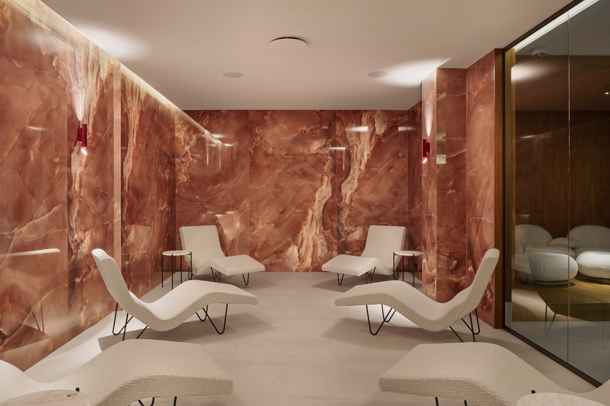 Marmi MaxFine Travertino embellishes the walls of the reception area, drinking station, changing rooms and restrooms, massage cubicles, and the geothermal hot tub. With its mottled green, white and grey pattern, MaxFine Amazonite gives the Turkish bath, the cold water jet rooms, the reception desk and the wall behind it a distinctive character. The spa is complemented by a lounge that is sure to amaze with its enveloping MaxFine Onyx Malaga hues. In the fitness area, instead, the restroom entrance areas were customized with the dark metallic effects of the Iron Black collection.