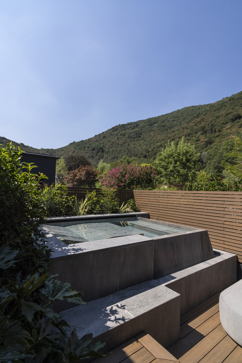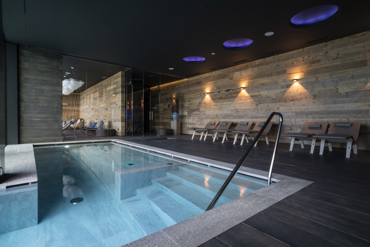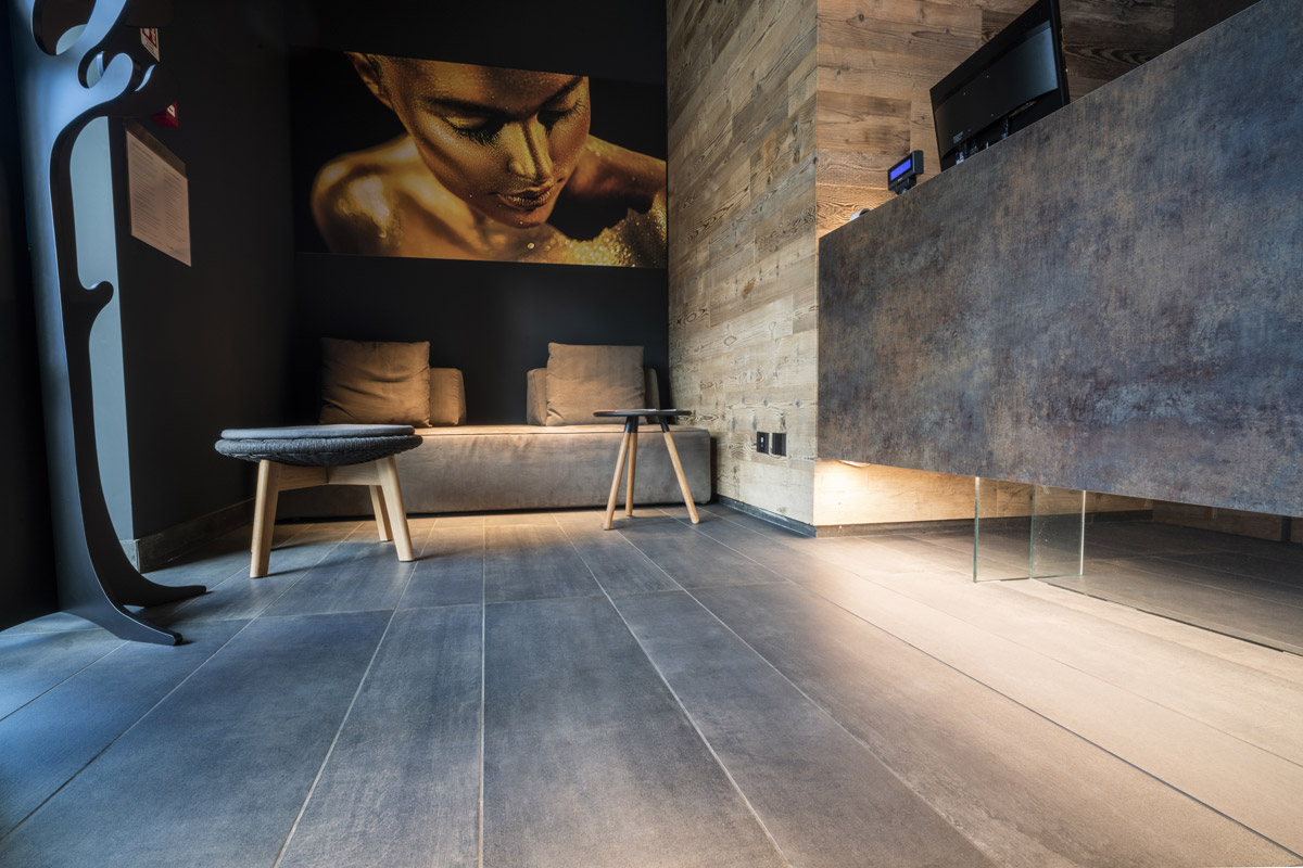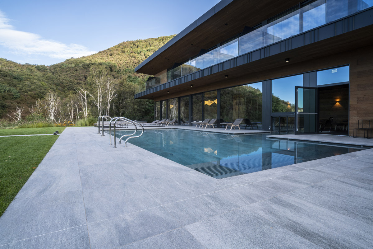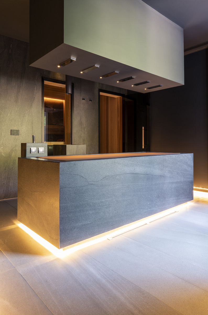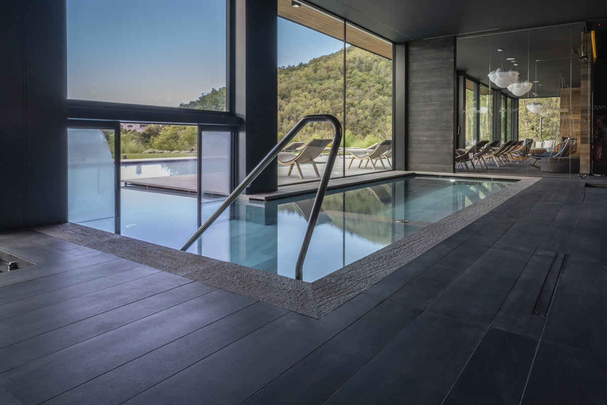 For the pool area and walkways, the choice of surfaces fell on FMG’s Quarzite collection in Cenere, while Iris Ceramica porcelain tiles were used for the Spa as well as balconies.