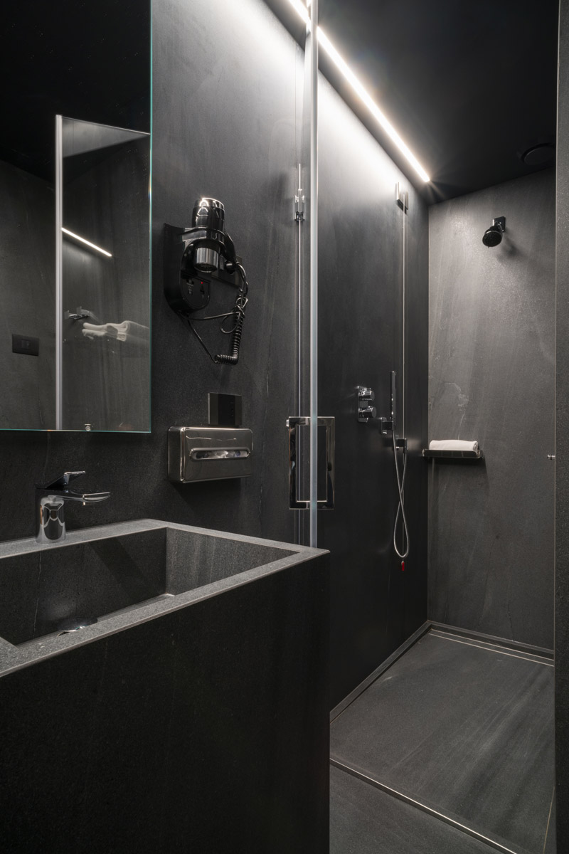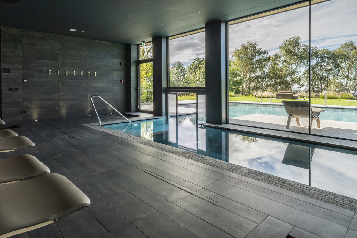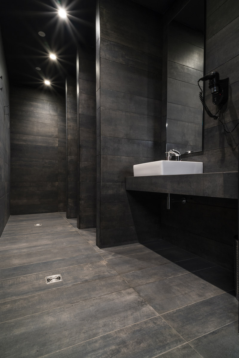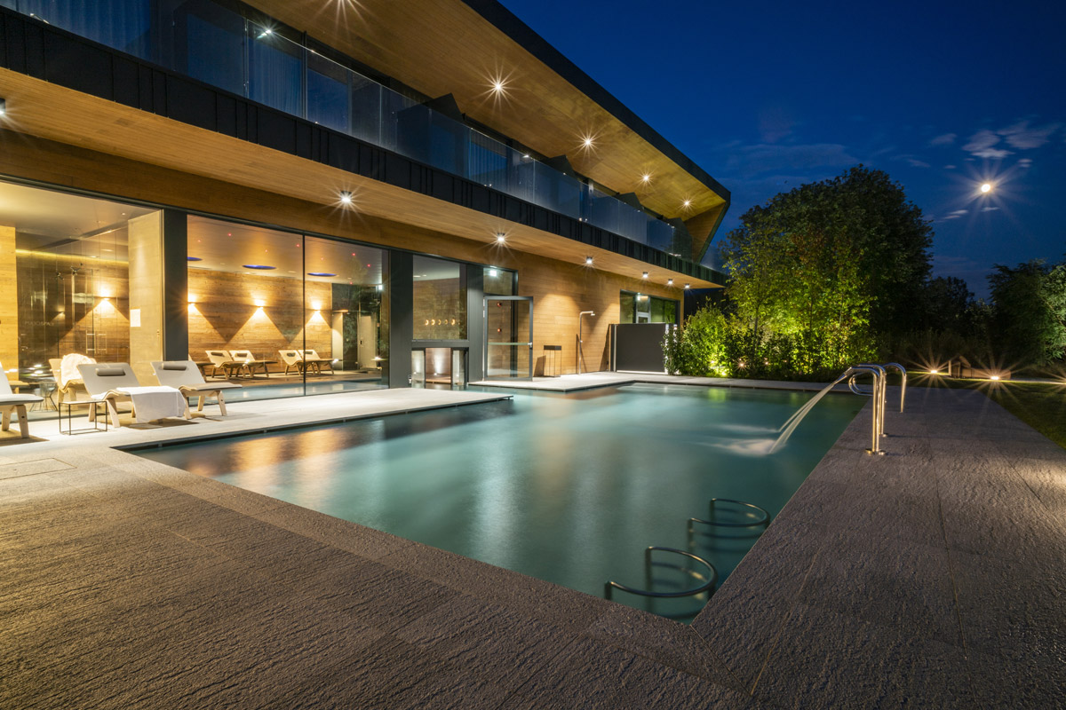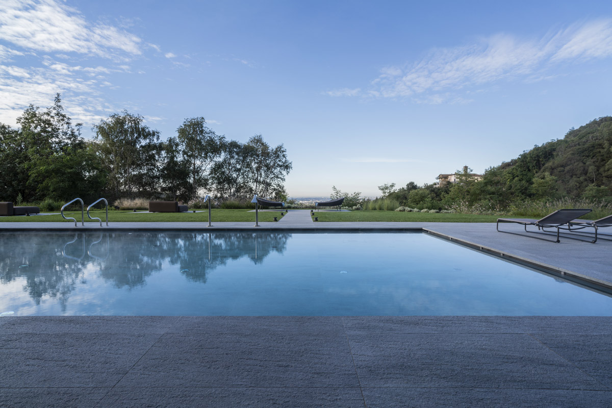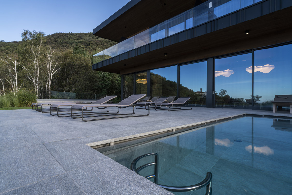 For the pool area and walkways, the choice of surfaces fell on FMG’s Quarzite collection in Cenere, while Iris Ceramica porcelain tiles were used for the Spa as well as balconies.