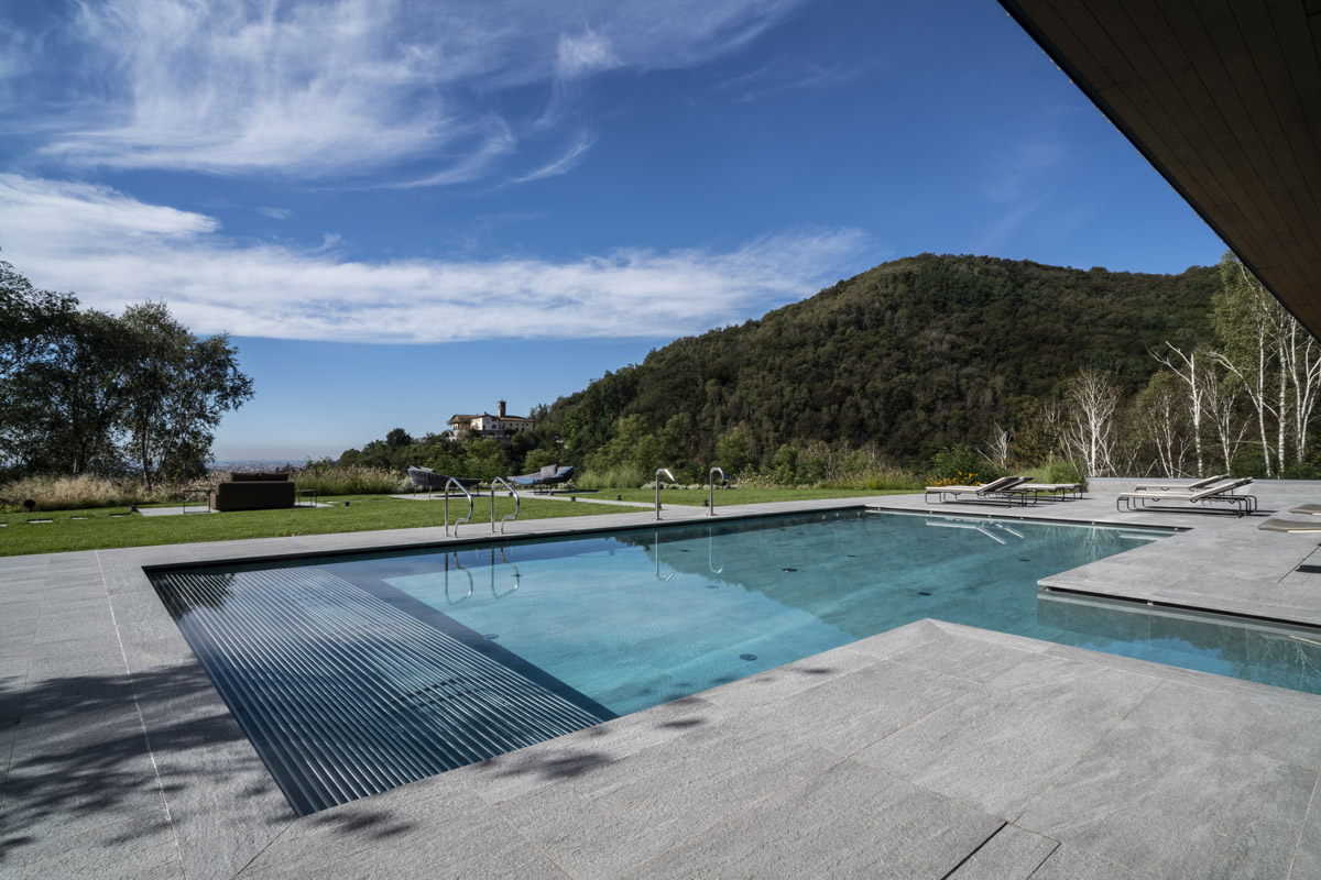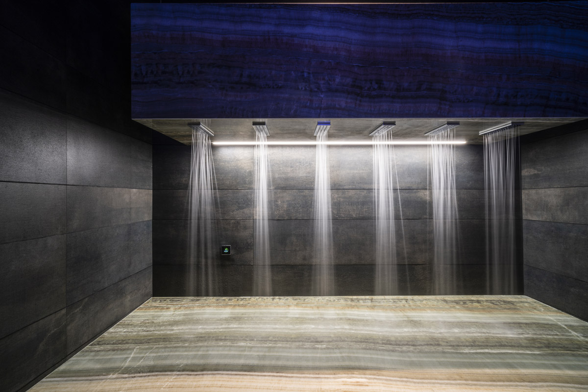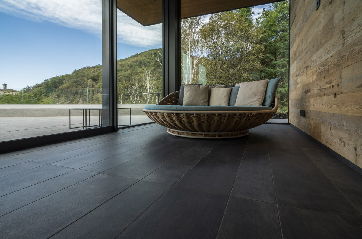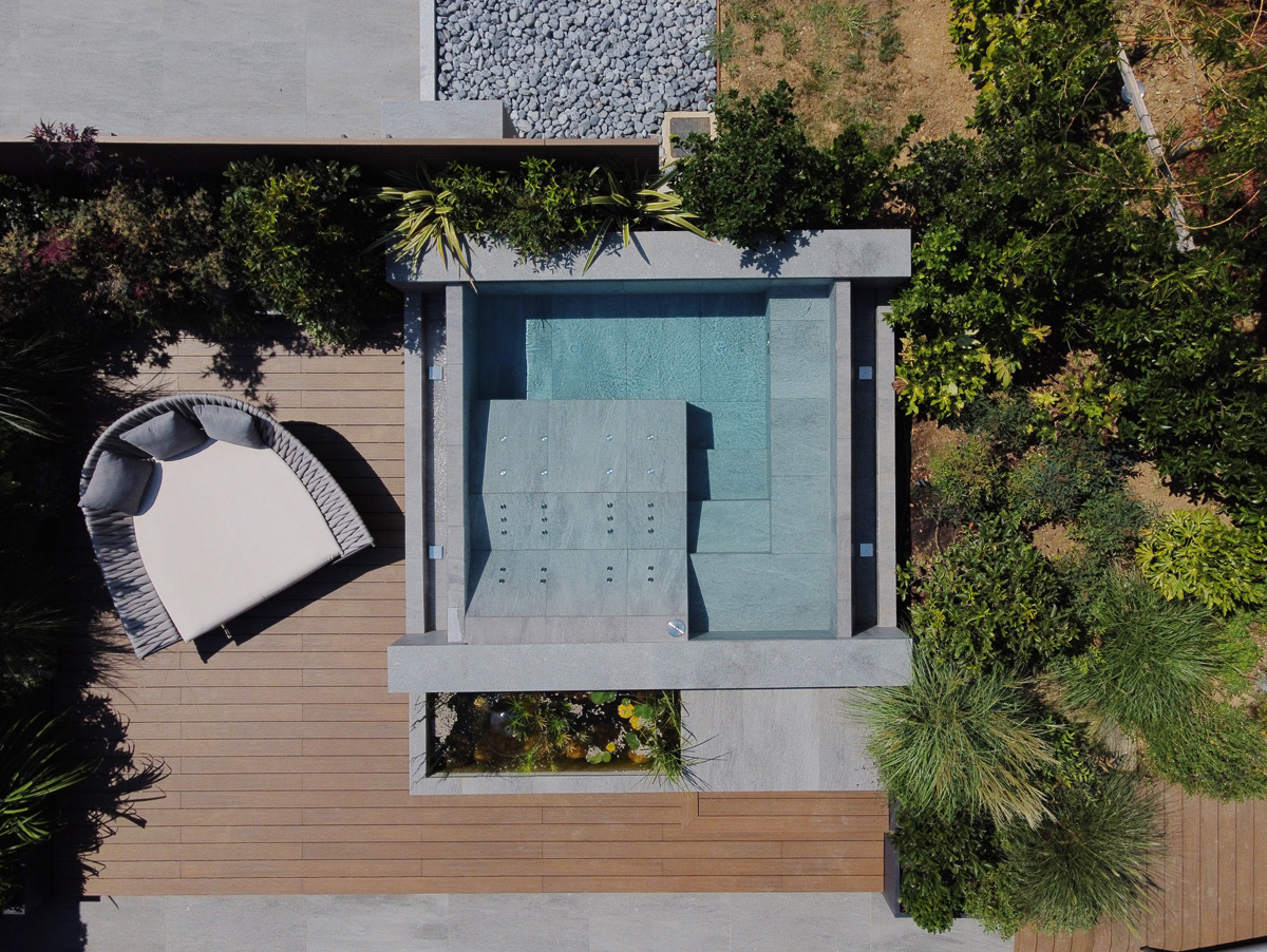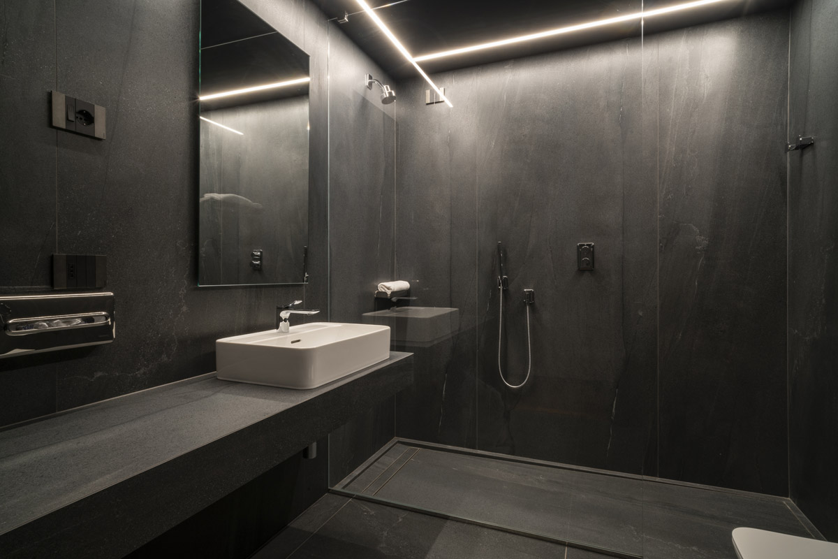 For the pool area and walkways, the choice of surfaces fell on FMG’s Quarzite collection in Cenere, while Iris Ceramica porcelain tiles were used for the Spa as well as balconies.