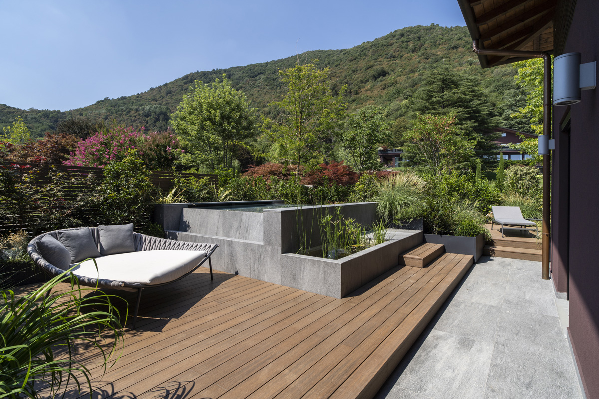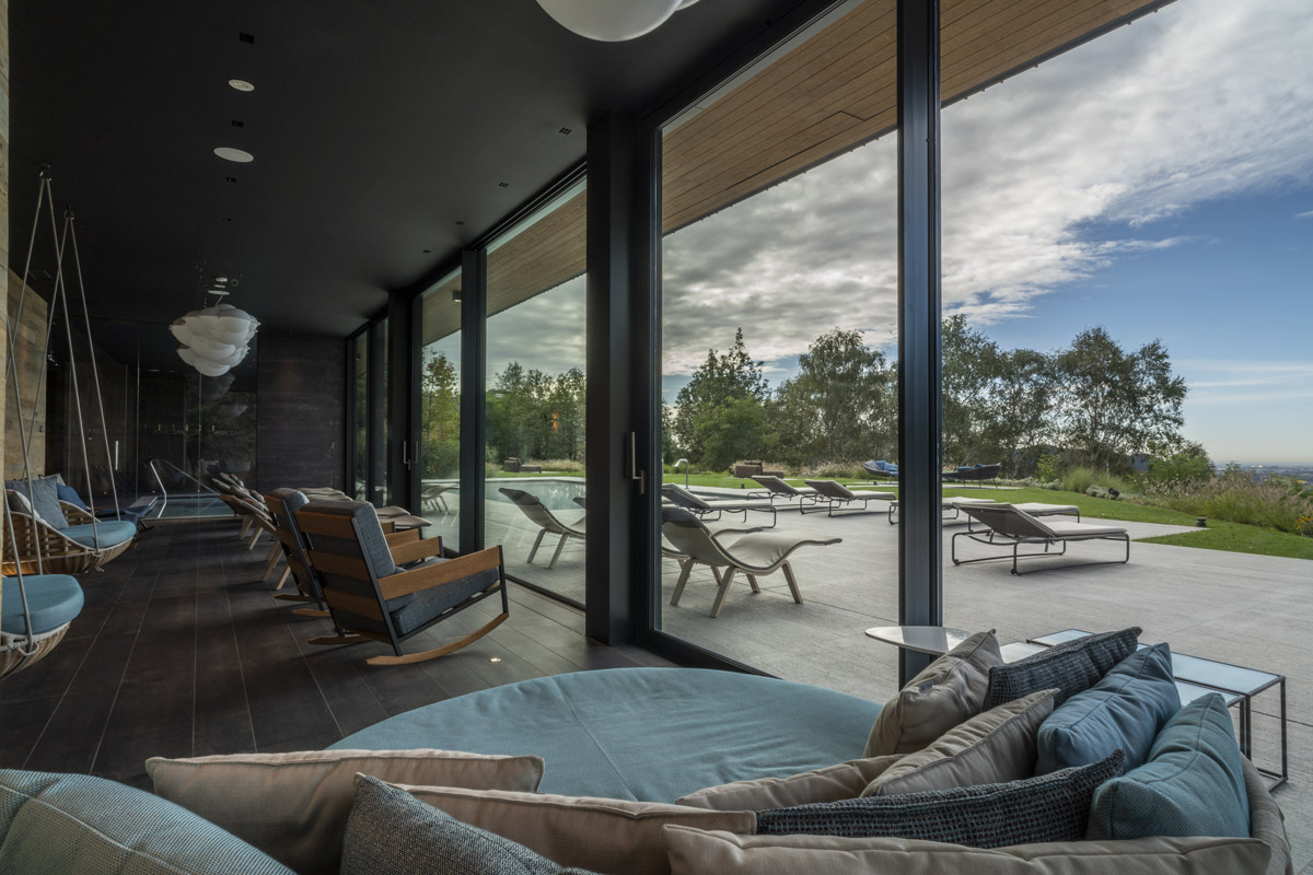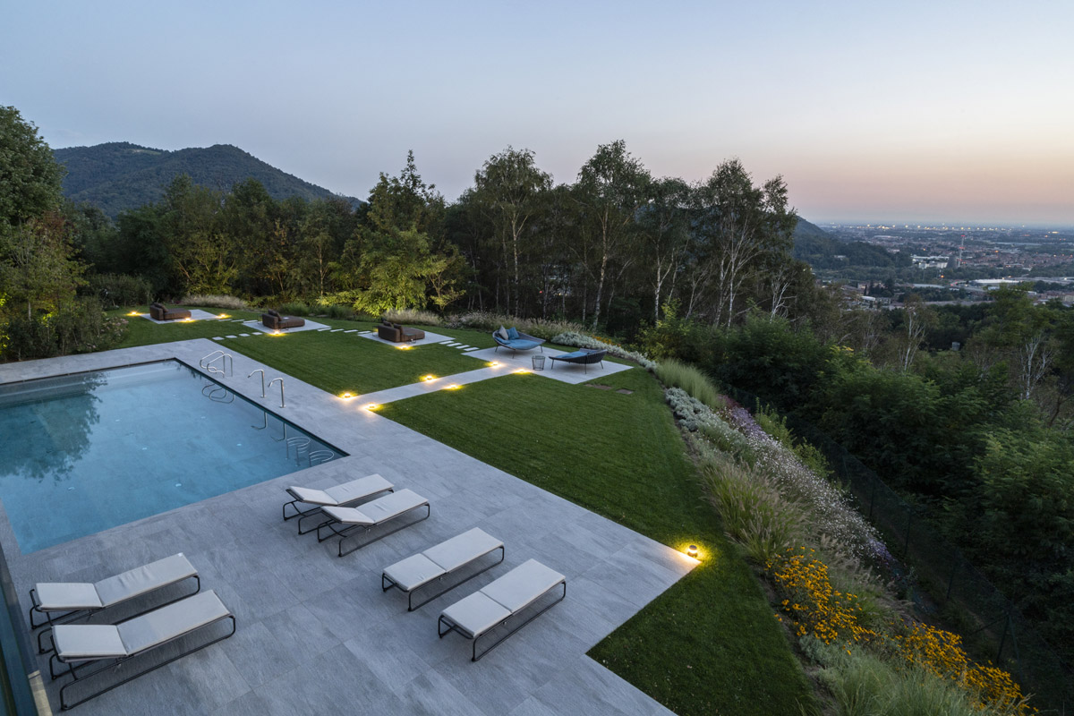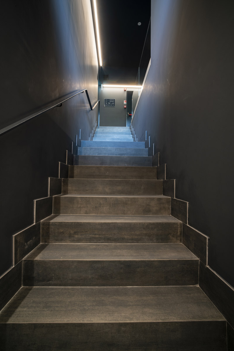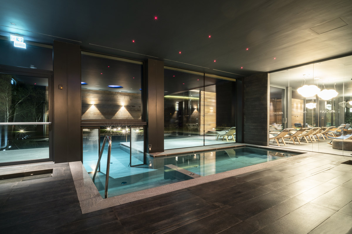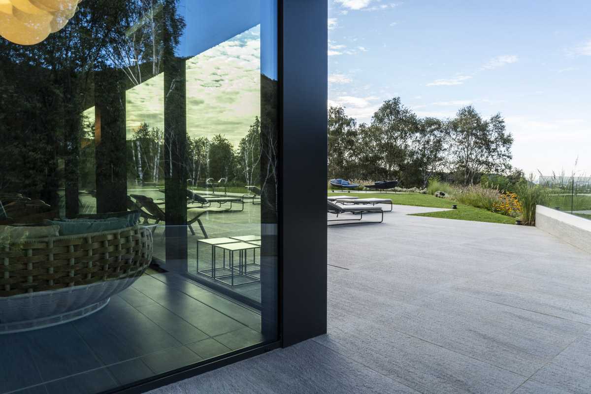 For the pool area and walkways, the choice of surfaces fell on FMG’s Quarzite collection in Cenere, while Iris Ceramica porcelain tiles were used for the Spa as well as balconies.