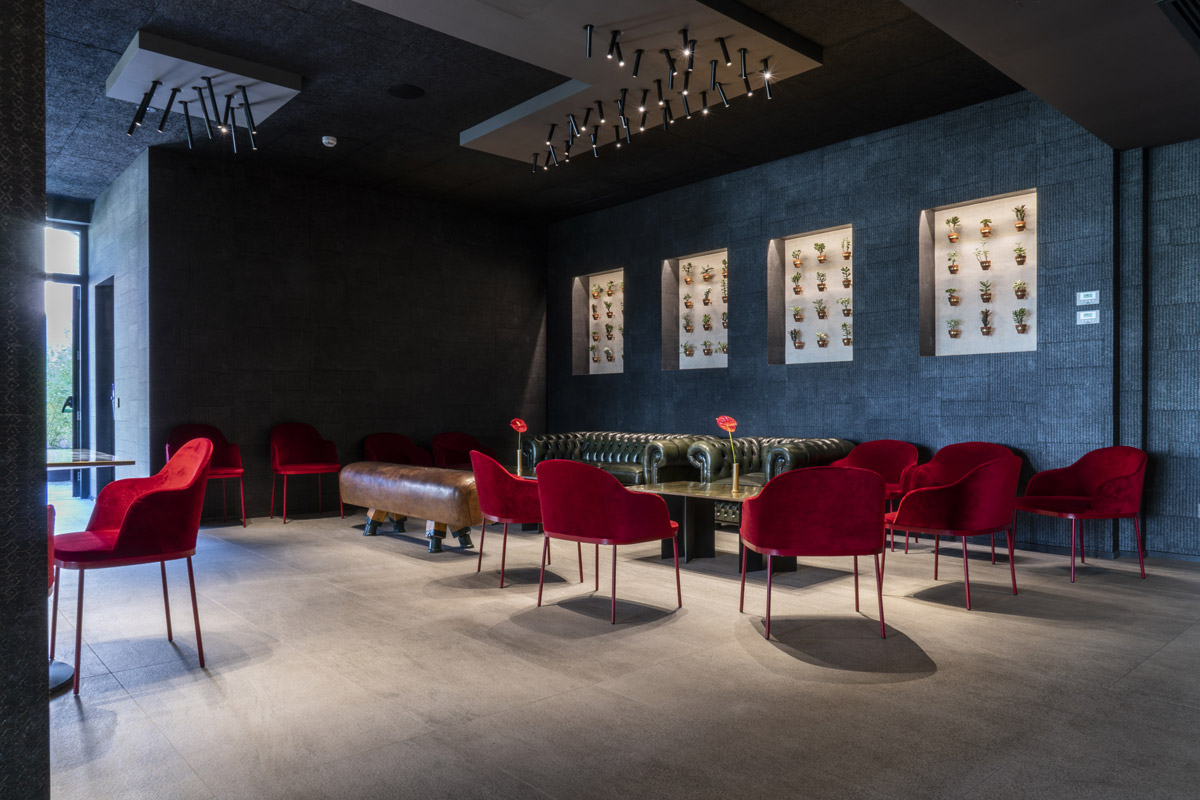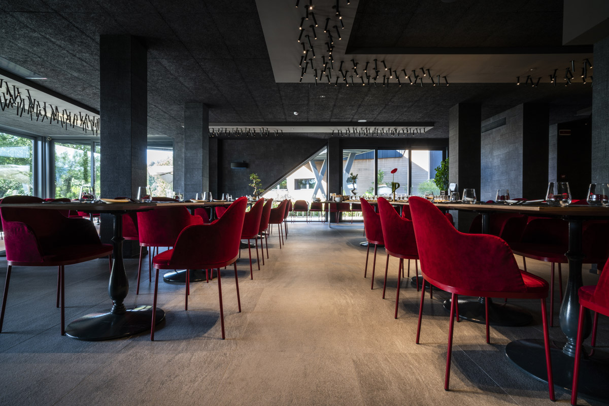 For the interior design of the Aroma restaurant, architect Nisi Magnoni used the exquisite Quarzite collection in Cenere natural finish, once again emphasizing the color contrast by using red furnishings.