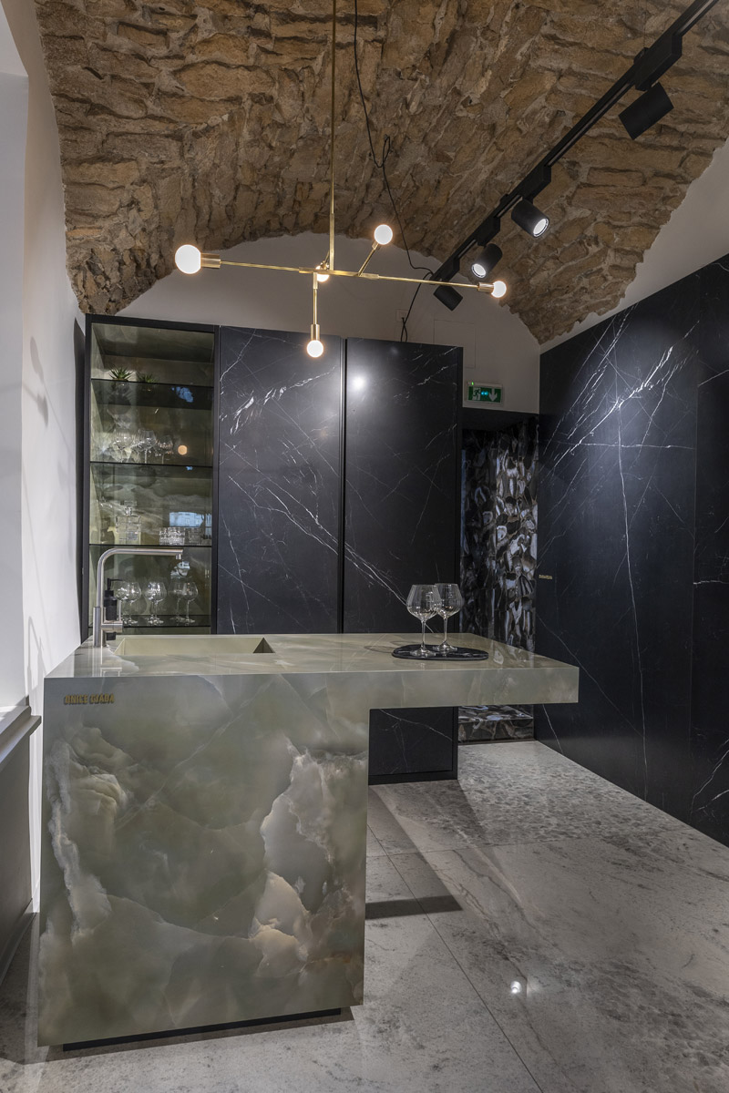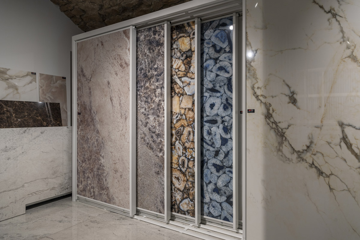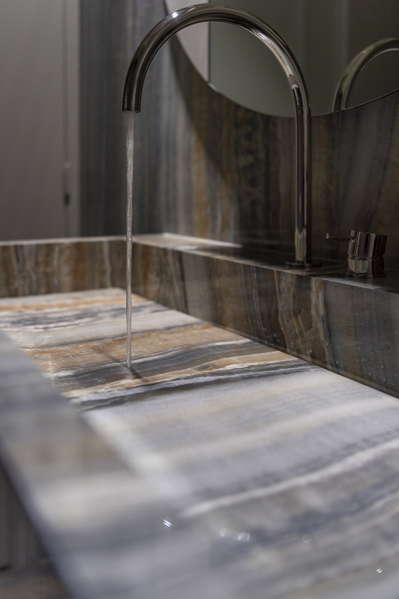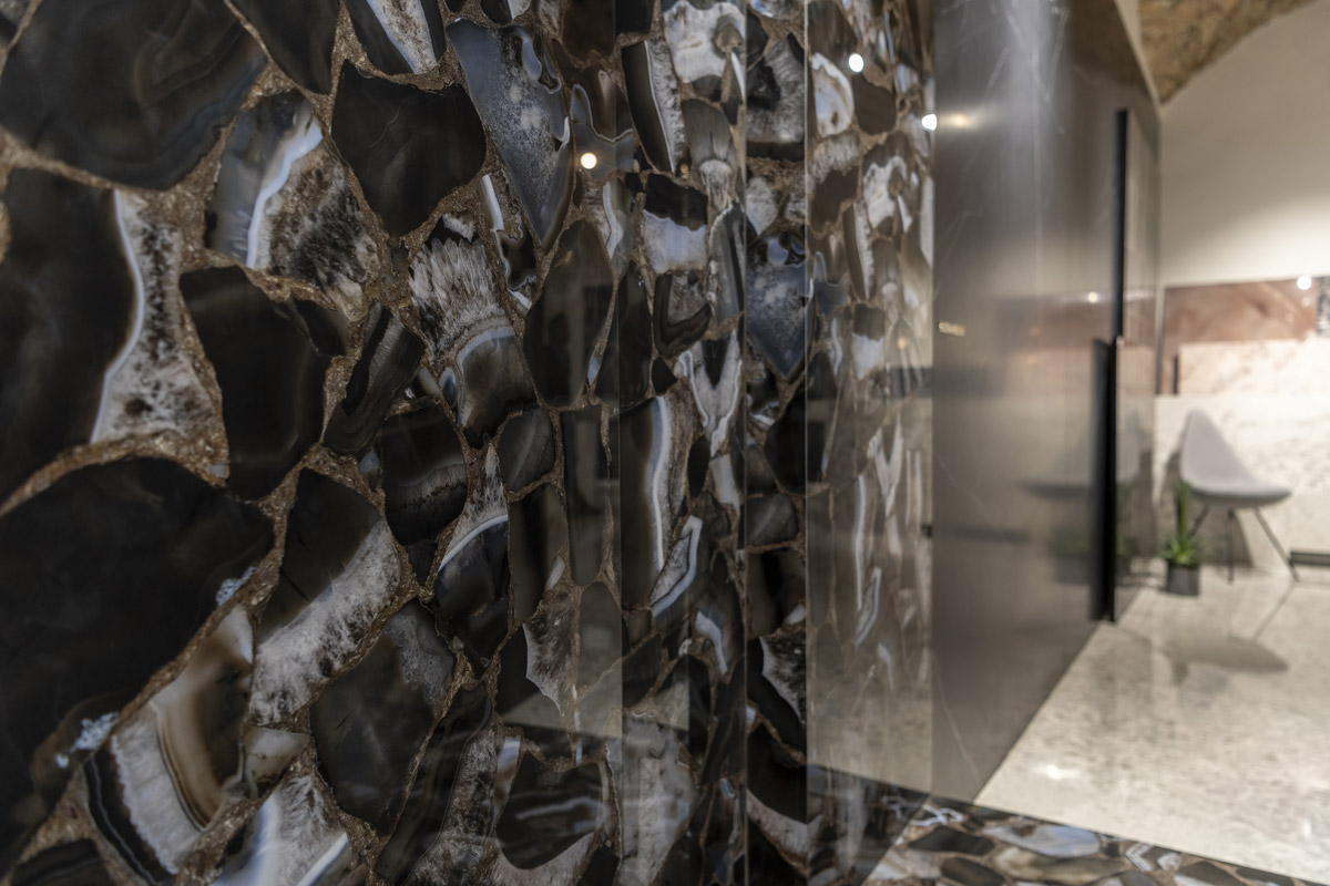 The Maxfine collections featured in the atelier range from charming Onici and the natural intensity of Citystone to elegant marble Emperador and the more recent, innovative and precious Gemstone and Agata collections, dedicated to the mineral world.