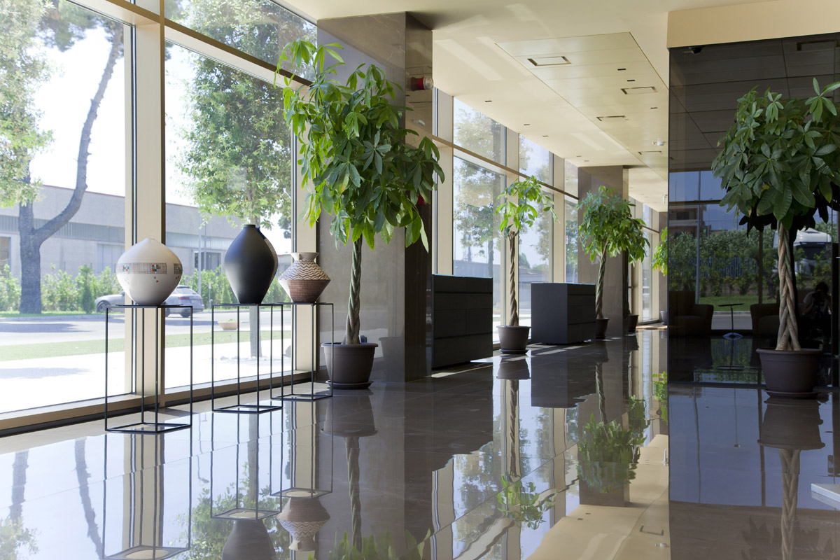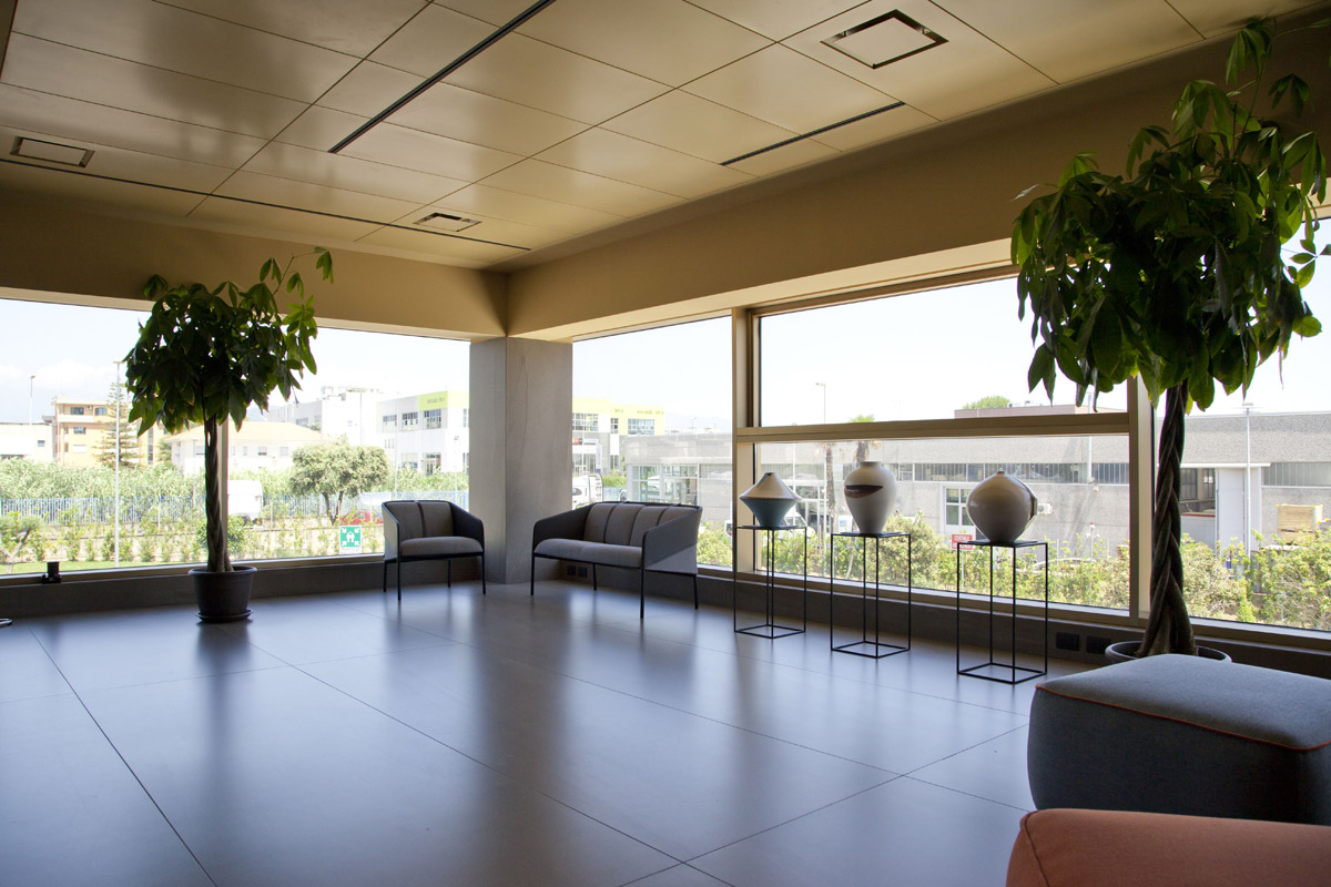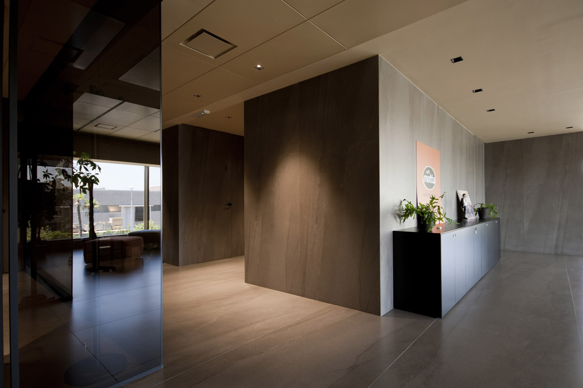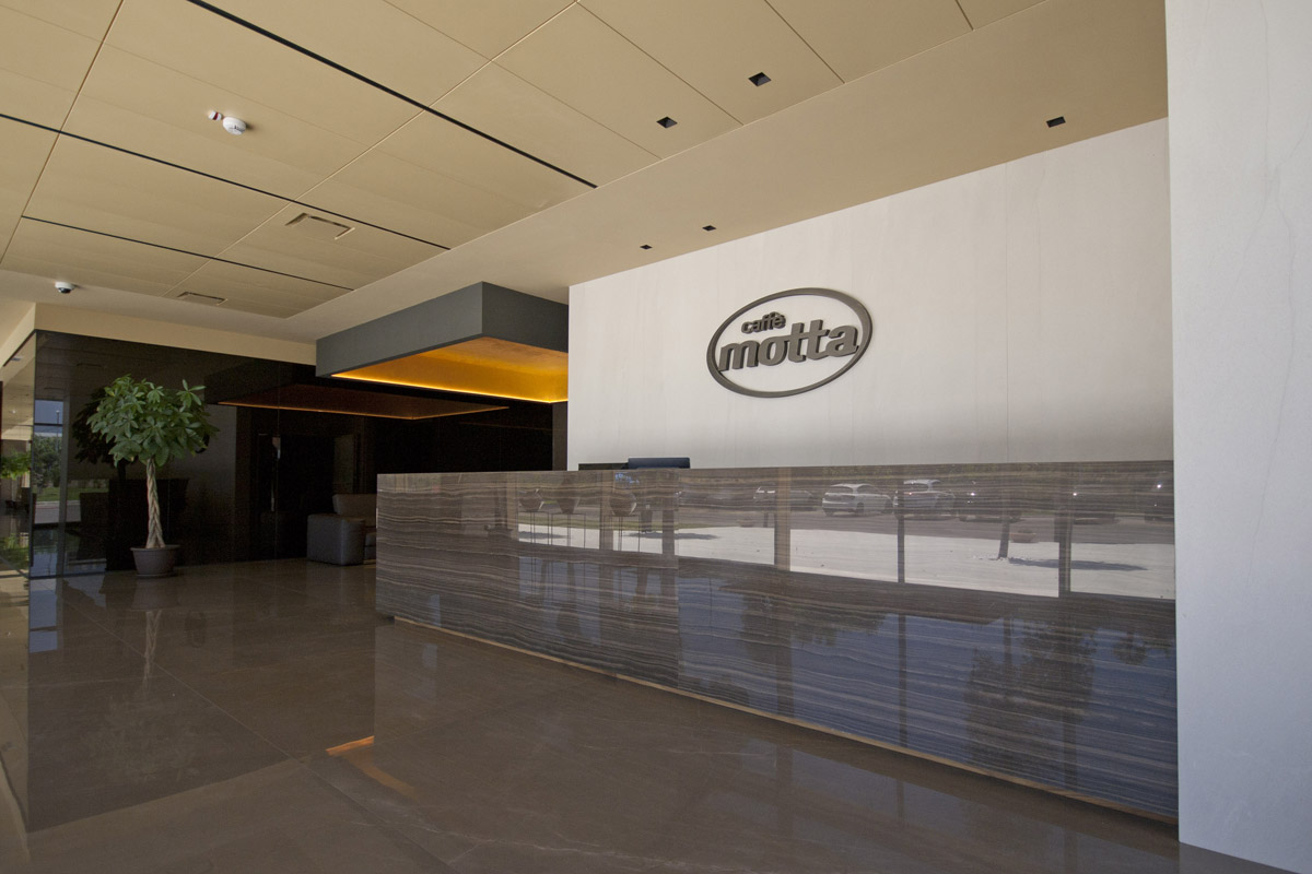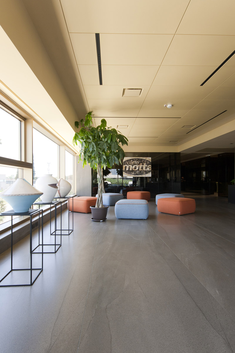 With FMG Fabbrica Marmi e Graniti large format technical ceramic tiles, Granese Architecture Design designed a new office building for leading brand Caffè Motta, at their industrial premises in Salerno.