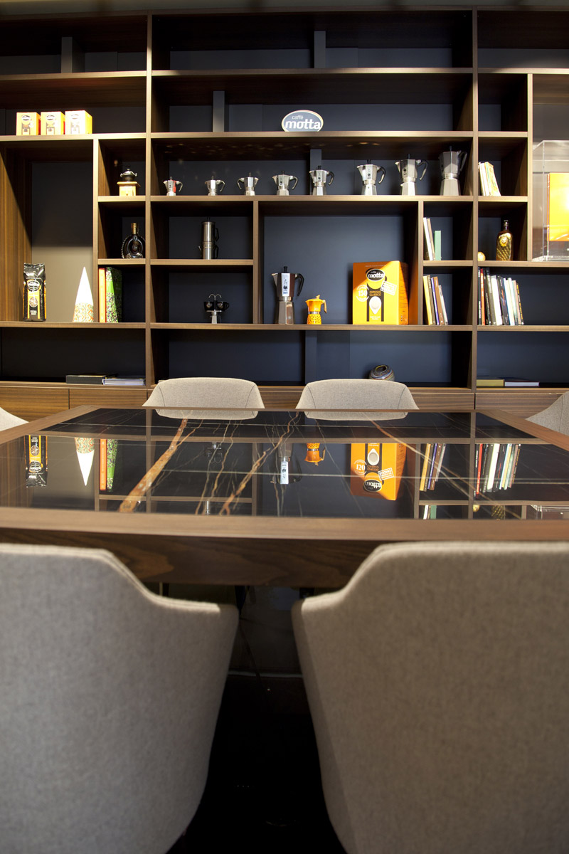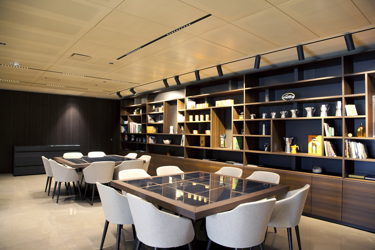 In line with the client’s requirements, the cozy atmosphere was accentuated with areas designed not just for employees but open to the public, for tasting and sharing opinions (including a “tasting room”, with movable partition to connect to a meeting room, and a café on the ground floor).