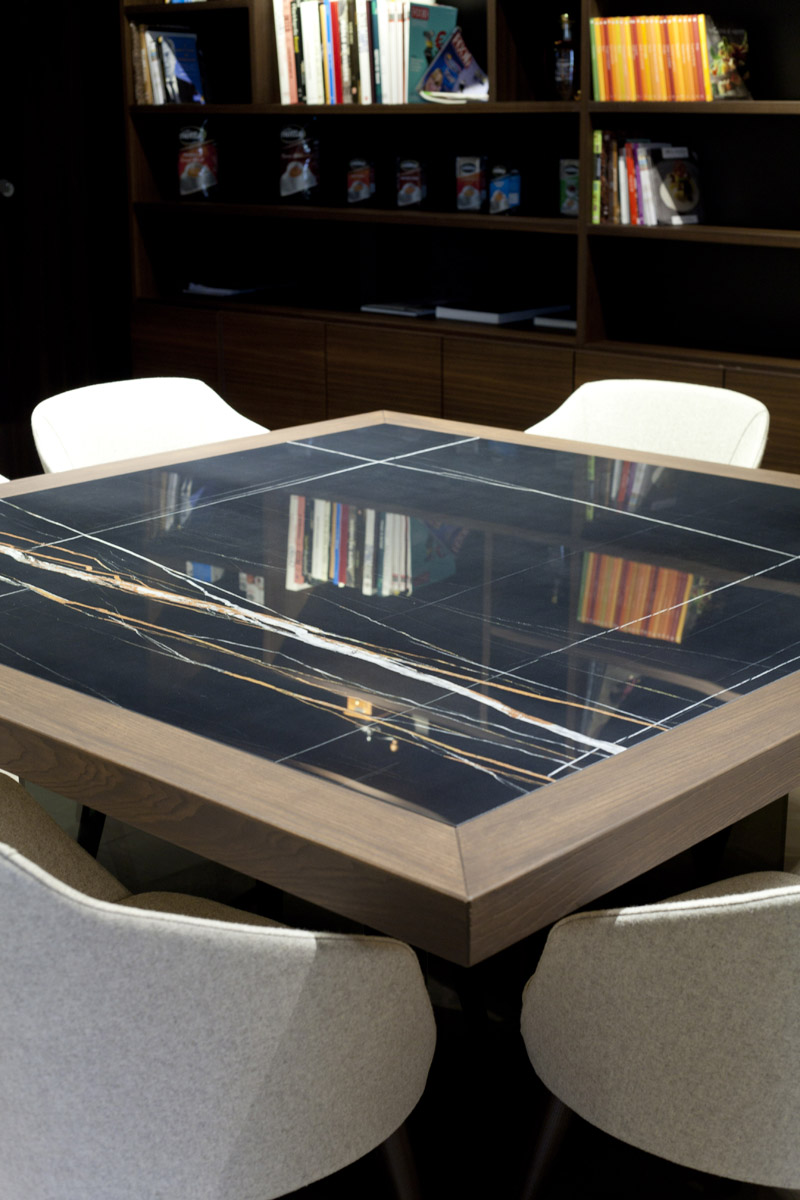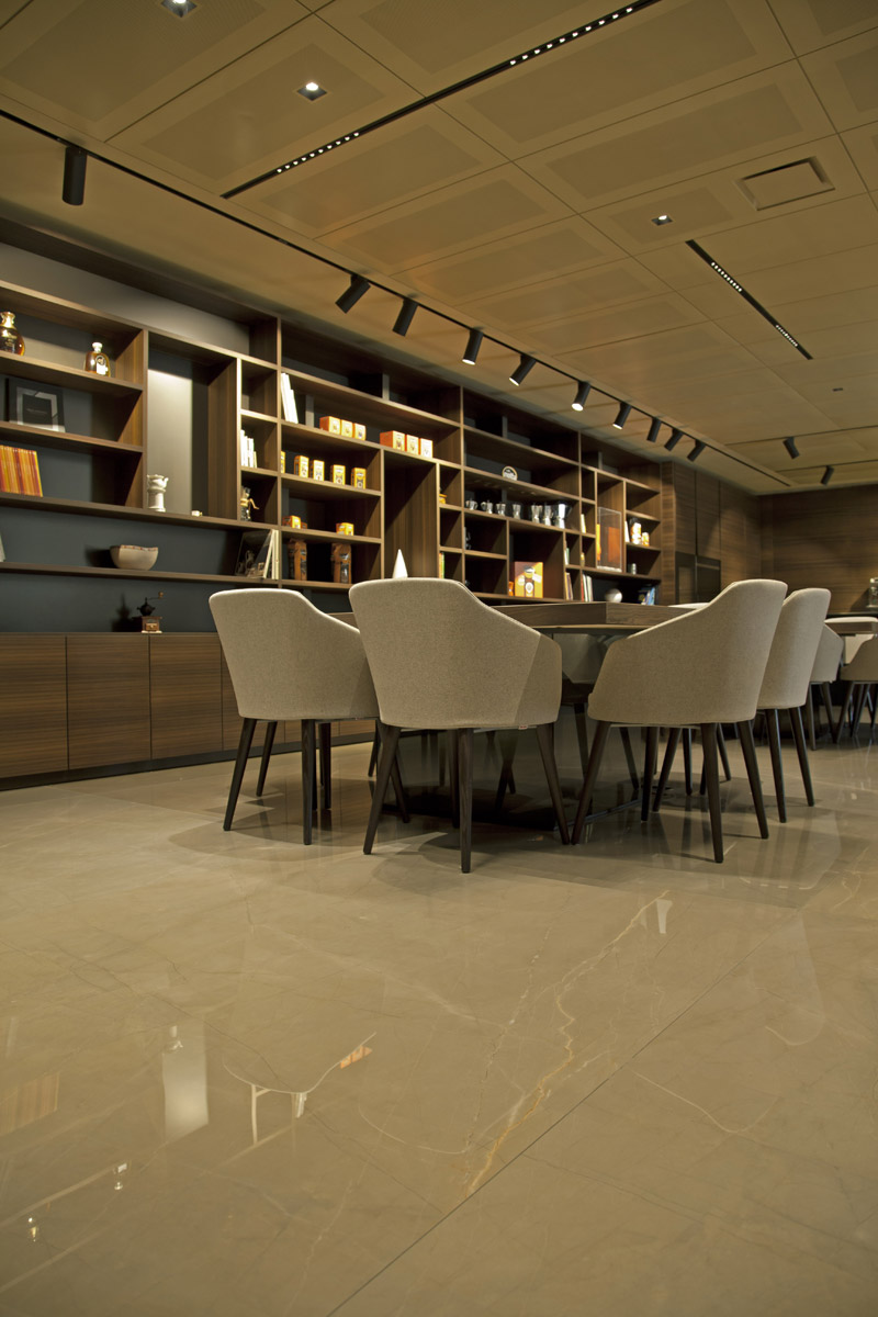 Tops of the square tables in the “tasting room”, customized with the stunning, dark background and gold highlights of Sahara Noir, alongside a reception desk in 150 x 300cm polished Eramosa, demonstrate the remarkable versatility of FMG large format tiles.