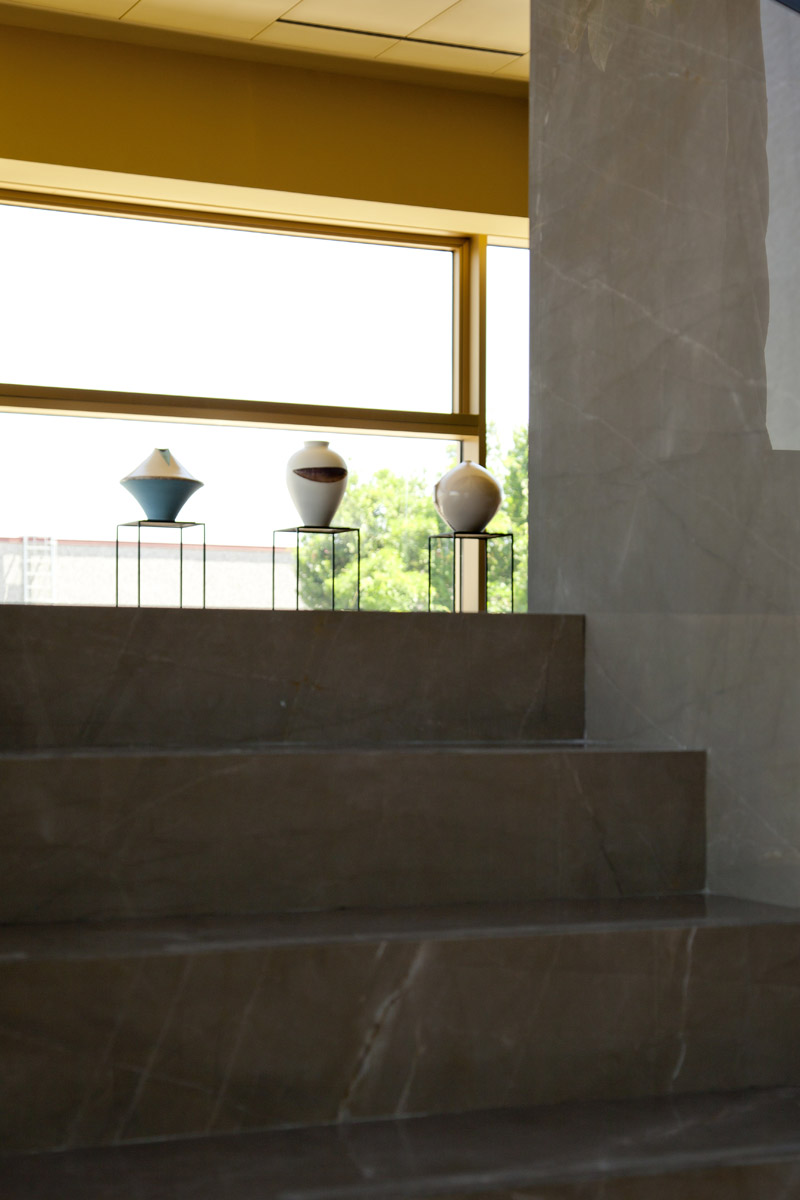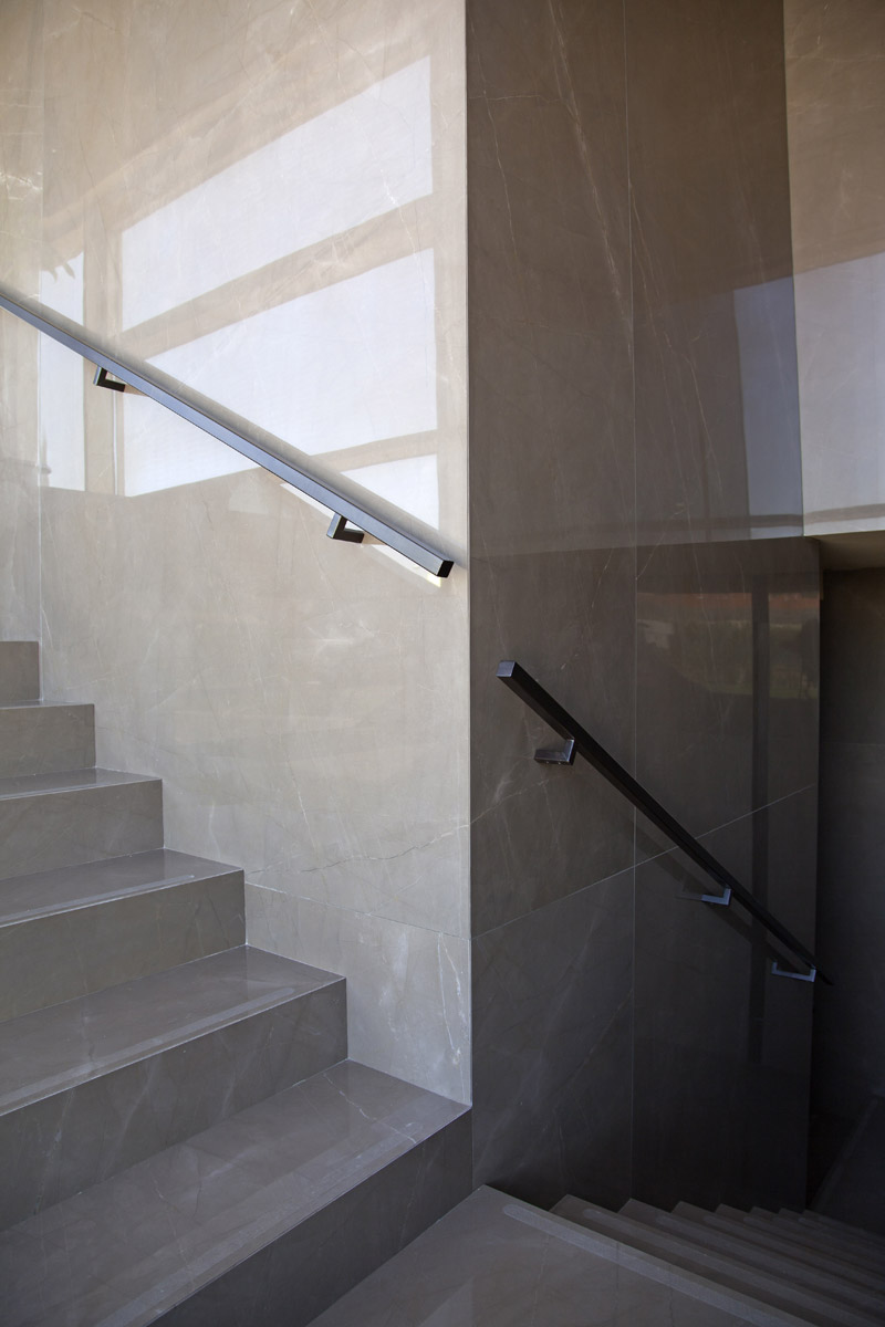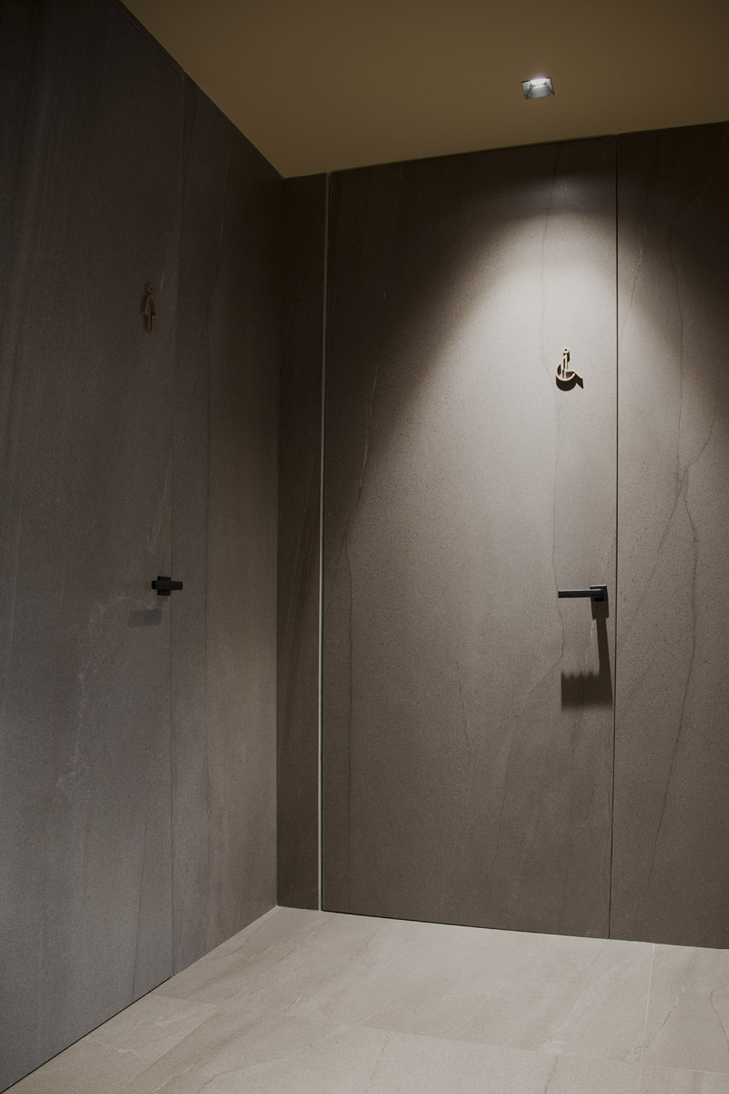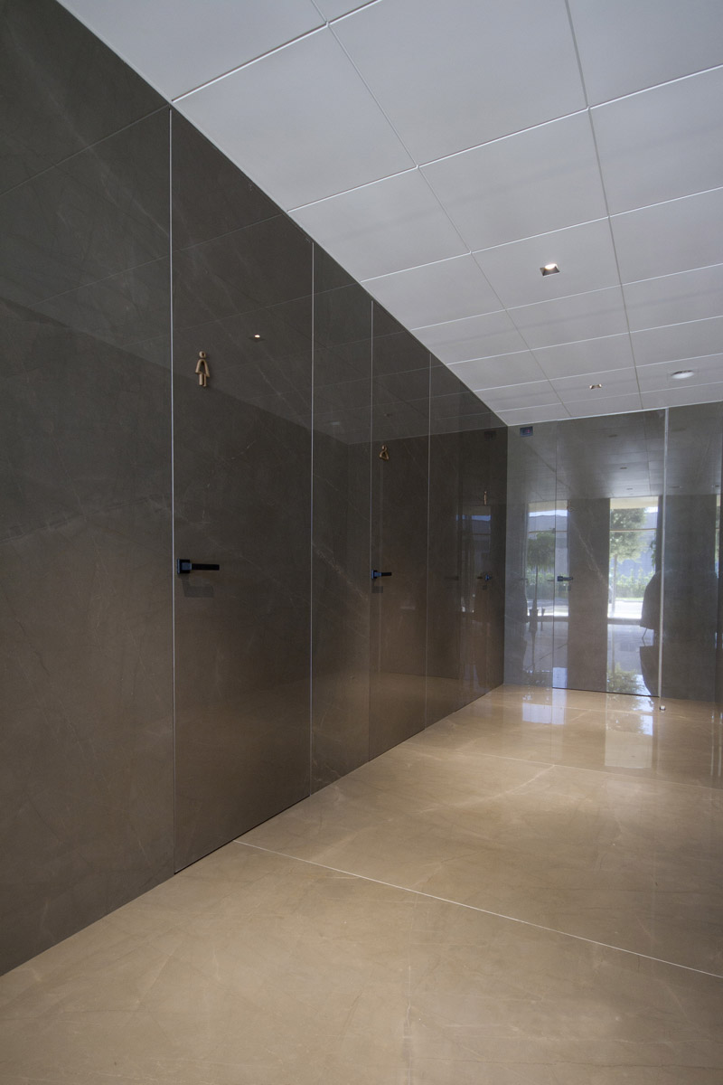 FMG’s comprehensive catalog of available collections also makes it possible to differentiate various spaces in terms of function or use. For example, high impact tiles were used in public rooms on the ground floor, while on the upper, more operational, floor the designer opted for a monolithic effect which creates a feeling of spaciousness.