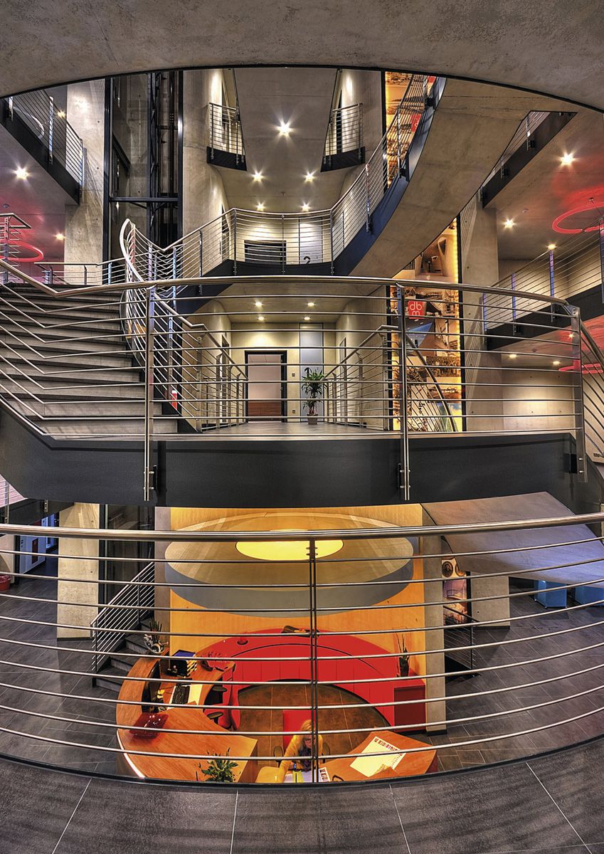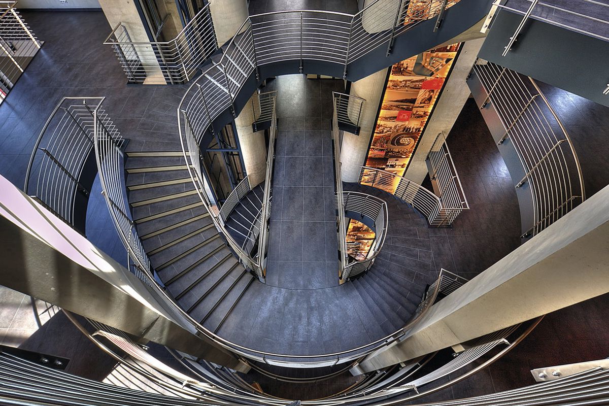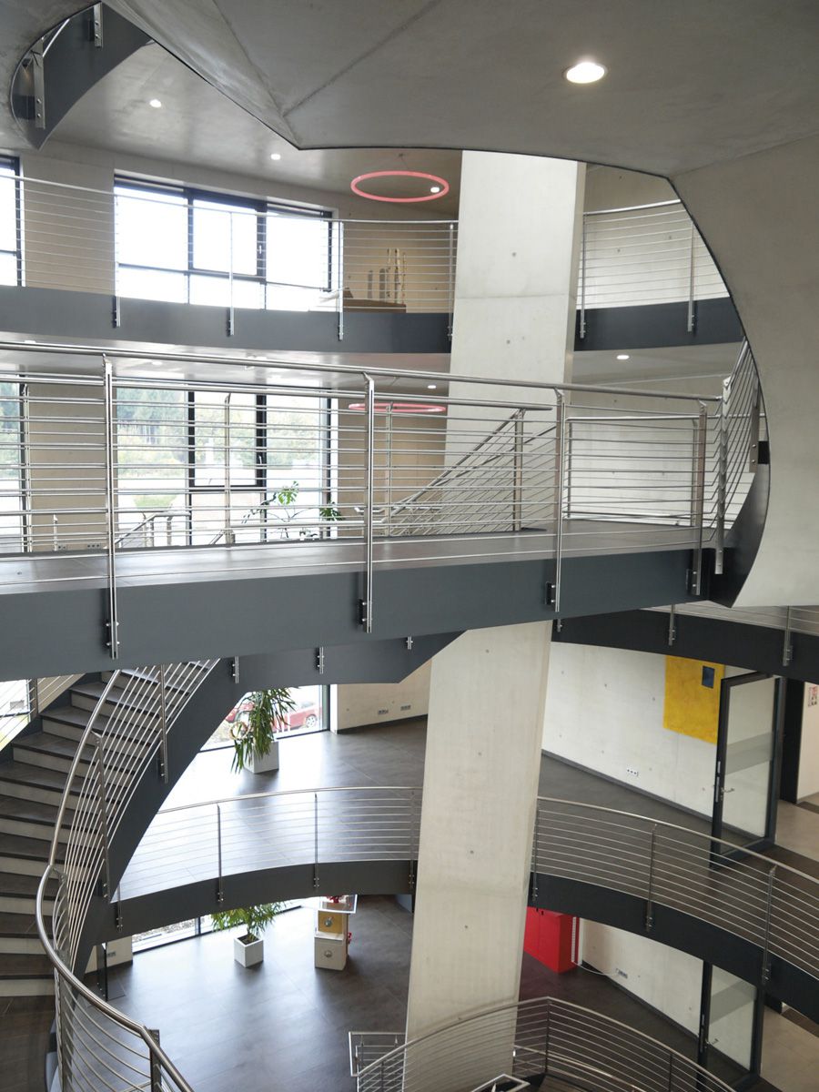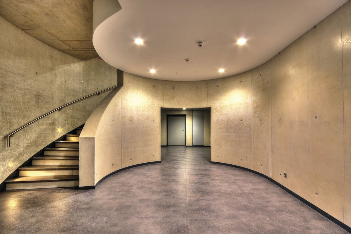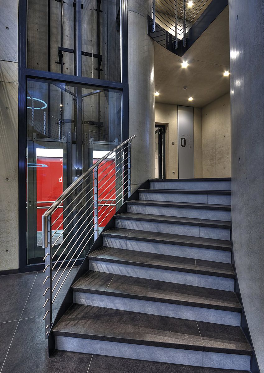 There is a particularly striking open space with many stairs and corridors covered in Dark Depth slabs, which produce a special weathered effect and perfectly match the steel elements of the stairs.