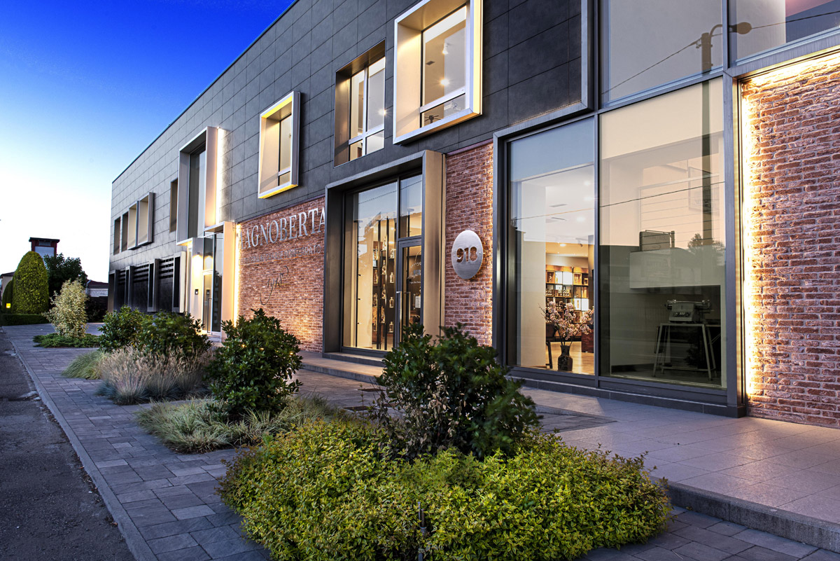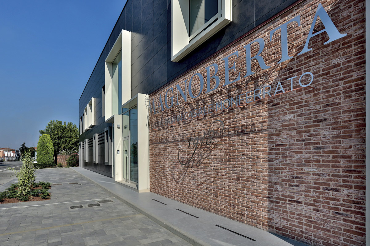 In a series of exhibitions and promotions celebrating its centenary, Magnoberta renovated the exterior appearance of its headquarters on Strada Asti, using an FMG ventilated facade system from the collection Roads Dark Depth slabs.