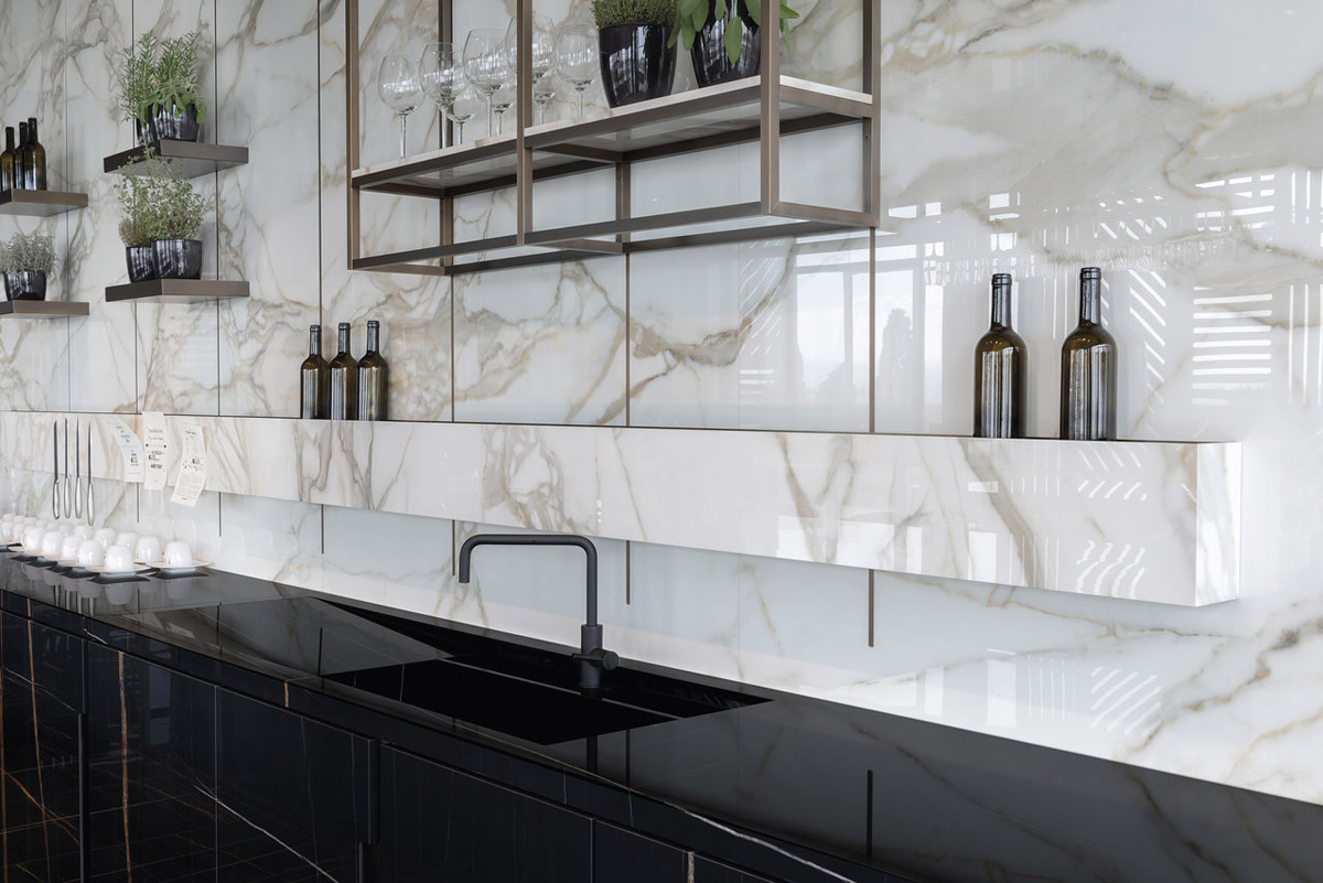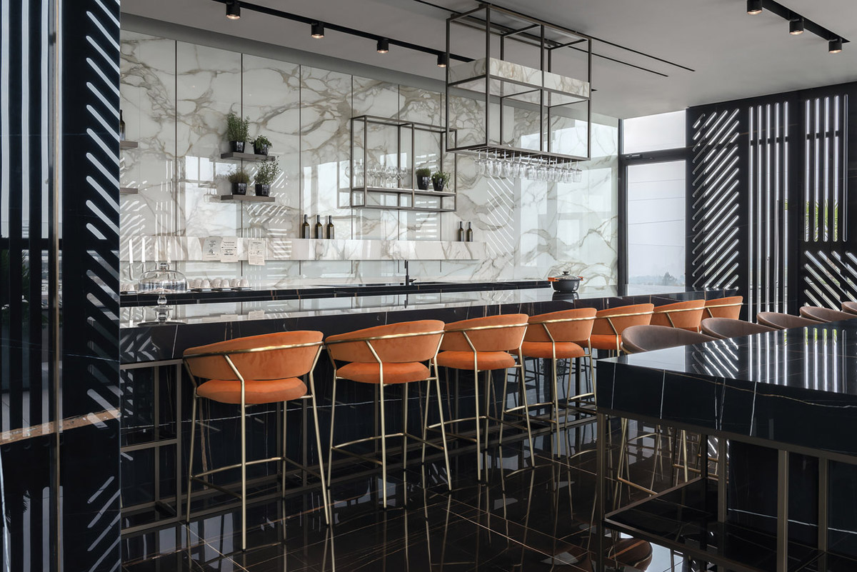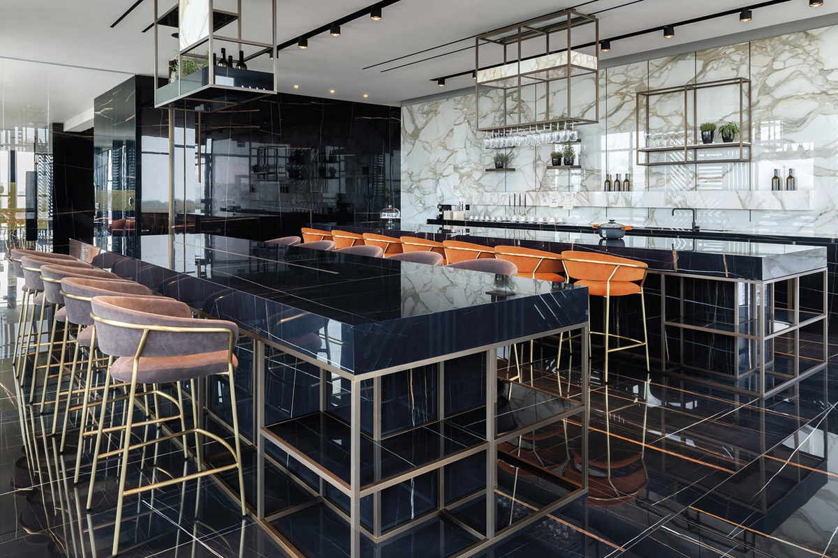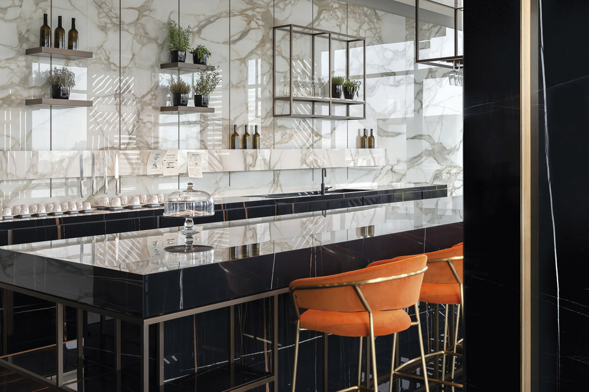 Calacatta Oro, with its lighter surface, provides a sophisticated color contrast in part of the meeting area and on a wall fitted with shelving and fittings in the bar-kitchen area.