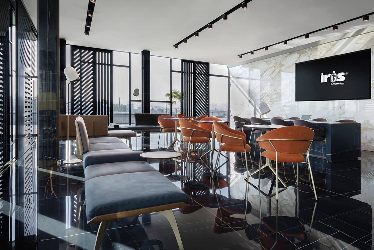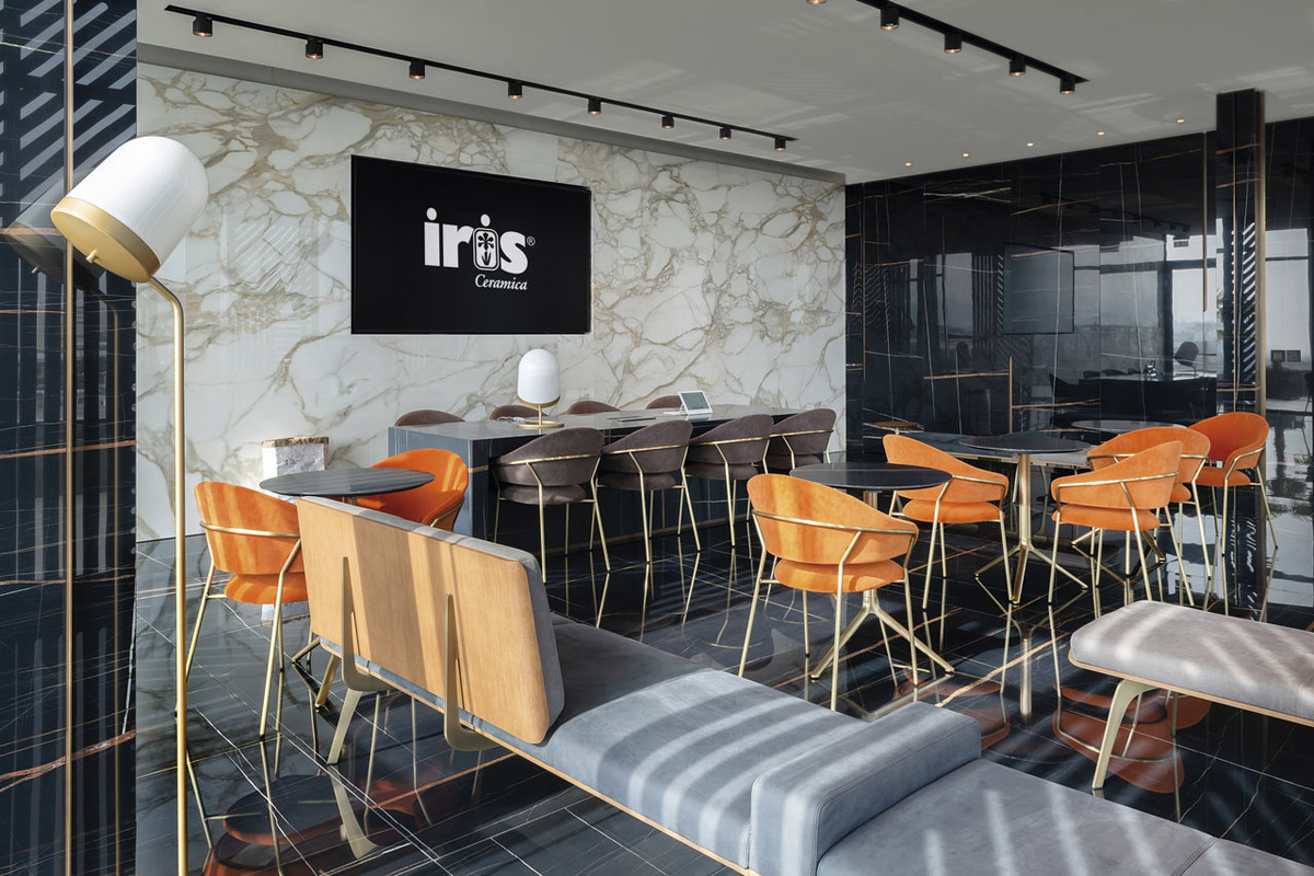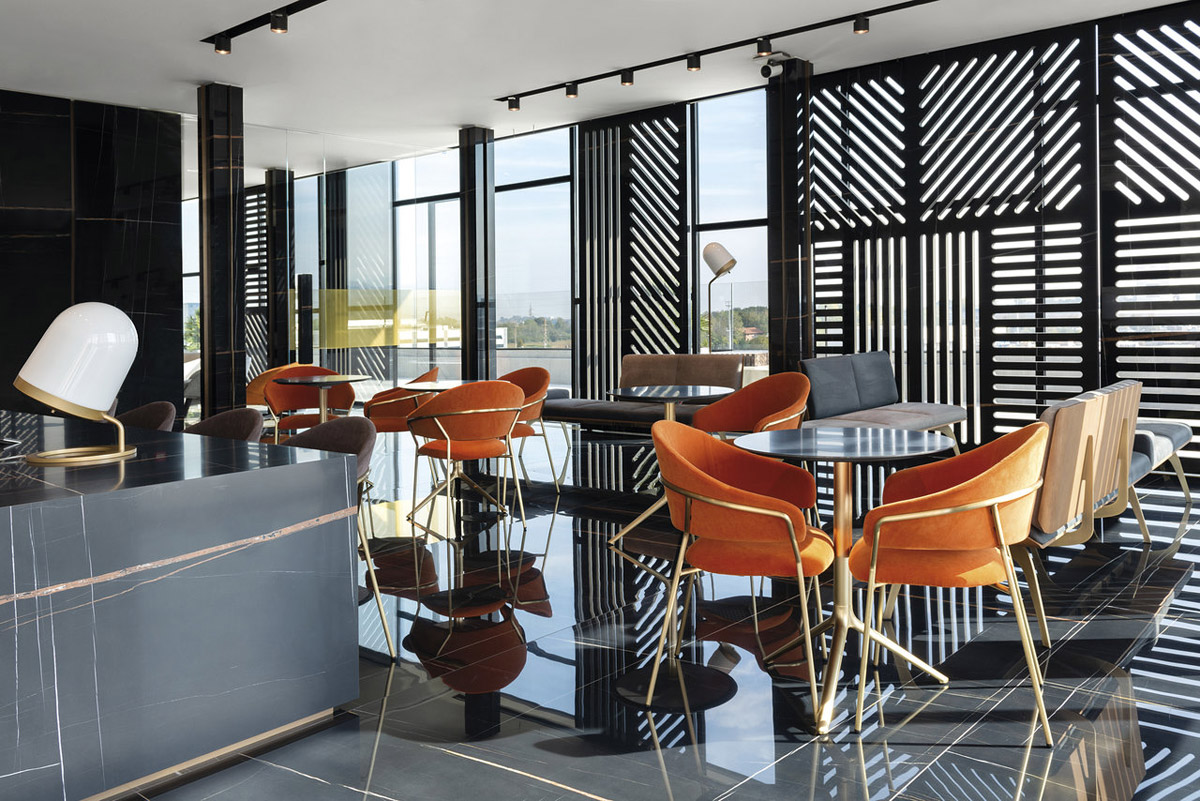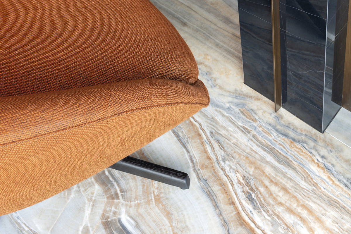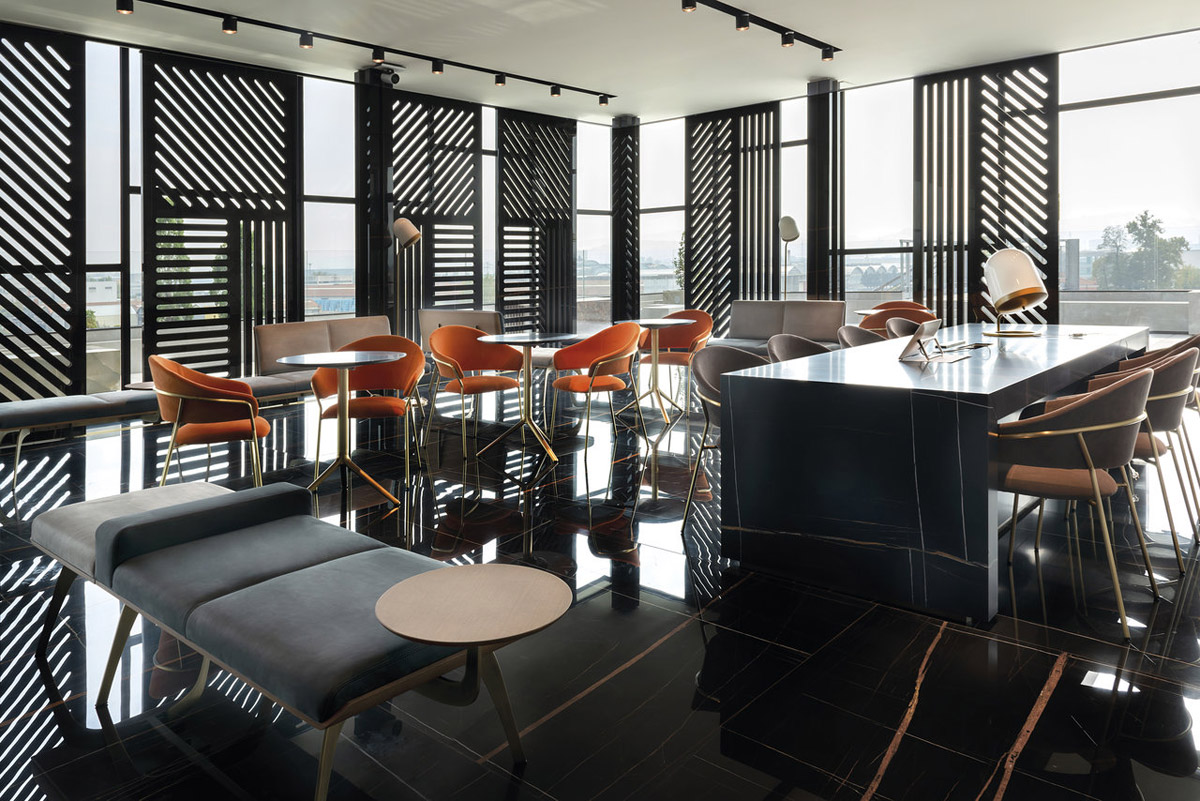 Calacatta Oro, with its lighter surface, provides a sophisticated color contrast in part of the meeting area and on a wall fitted with shelving and fittings in the bar-kitchen area.