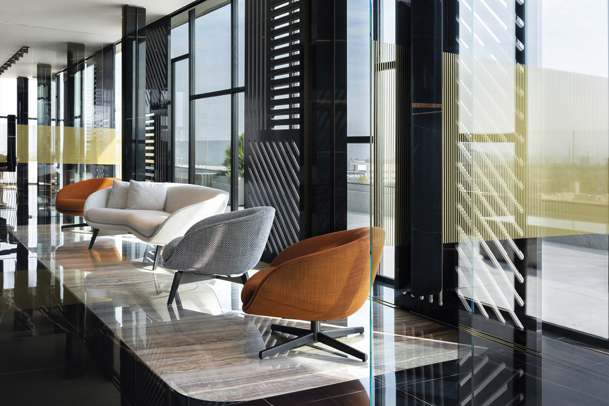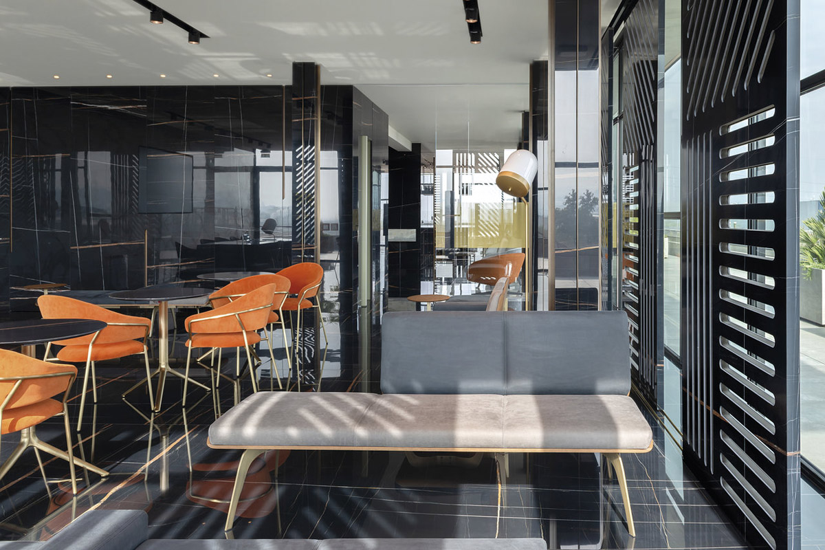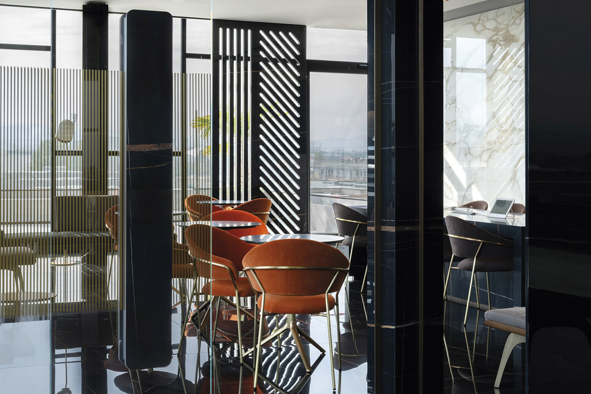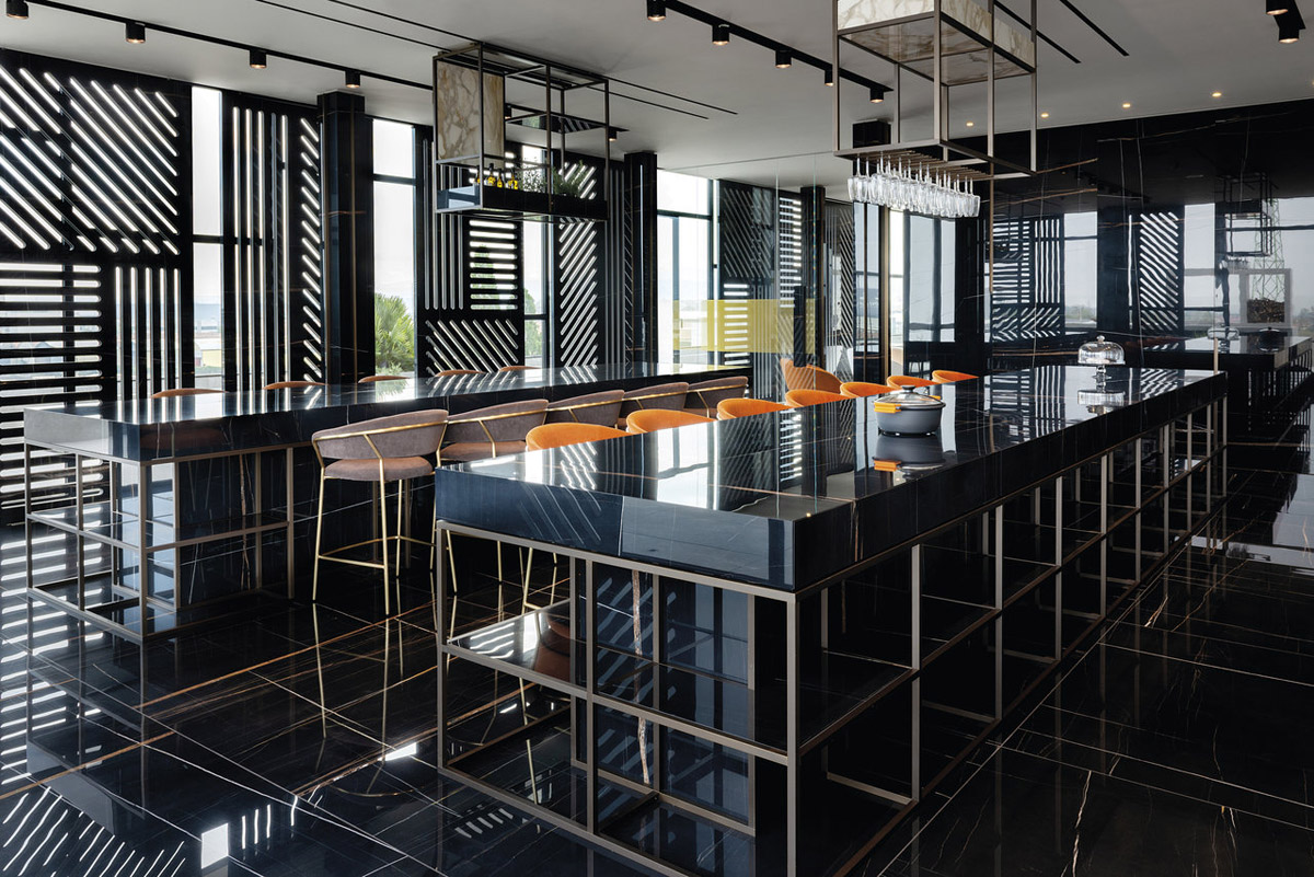 Sahara Noir is the predominant design in the interior, laid on floors, dining and occasional tables, perimeter pillars and sun screens which shade the large windows.