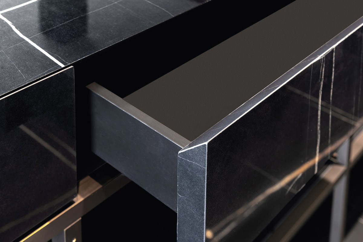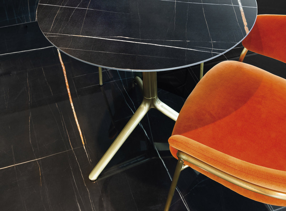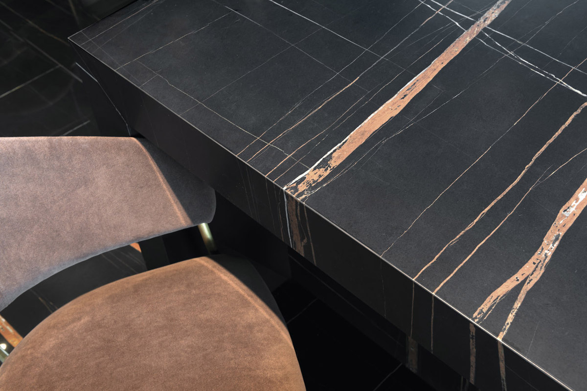 Large-format MaxFine tiles unquestionably take center stage. Porcelain surfaces reinterpret the most precious, rare natural materials and cover walls, floors, architectural features and designer furnishings like a second skin. In The Attico, maxi-format waterjet-cut ceramics are transformed into coffee tables, storage units, brise-soleil, kitchen worktops, counters and seats.