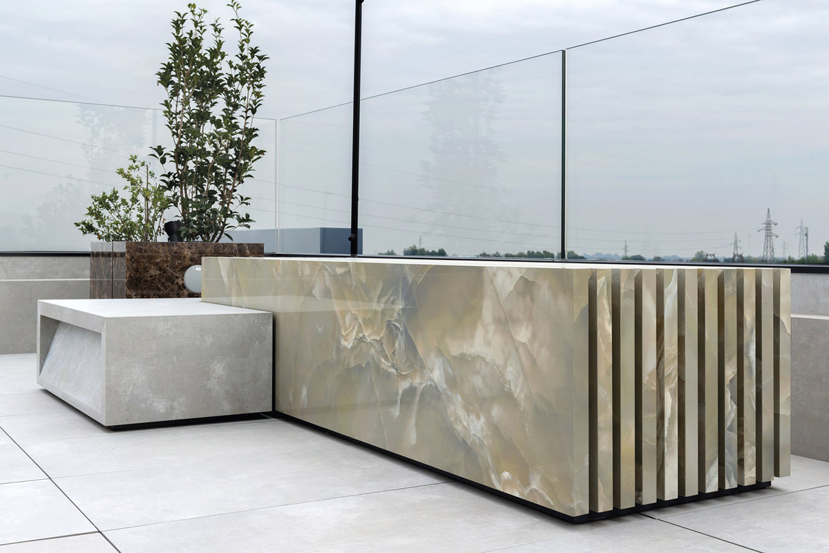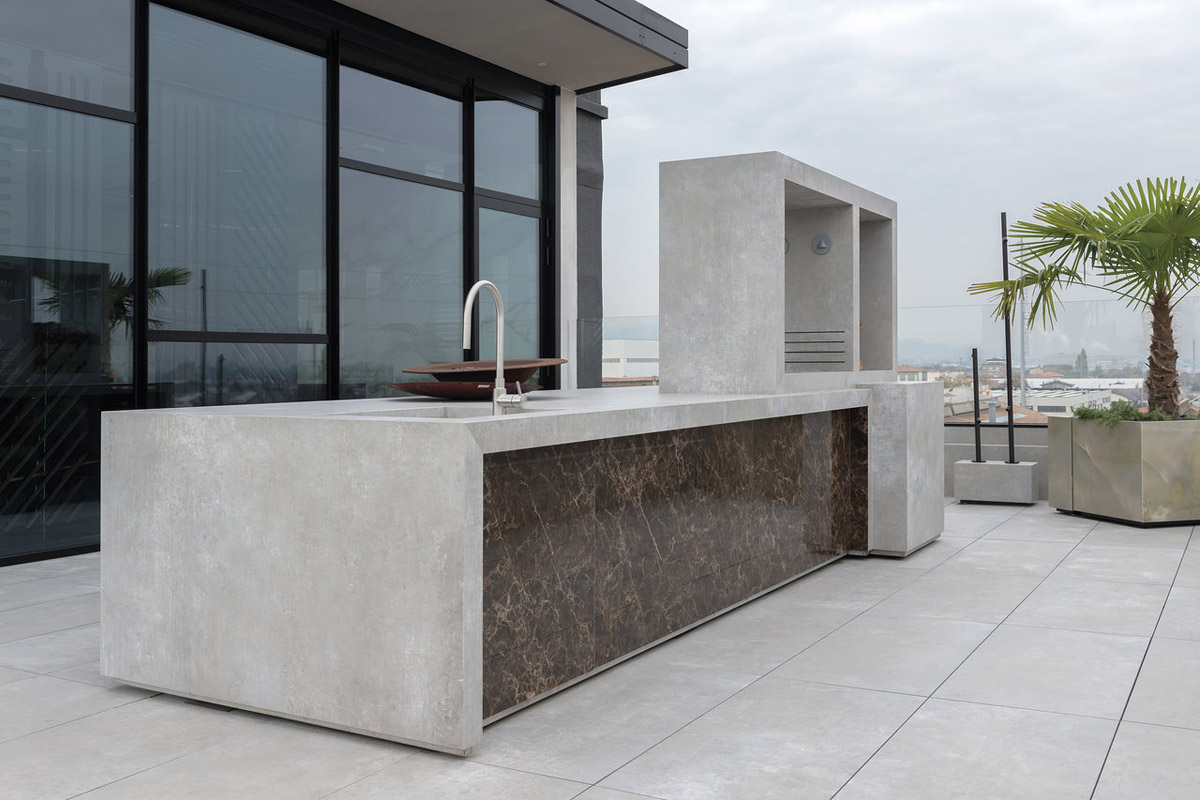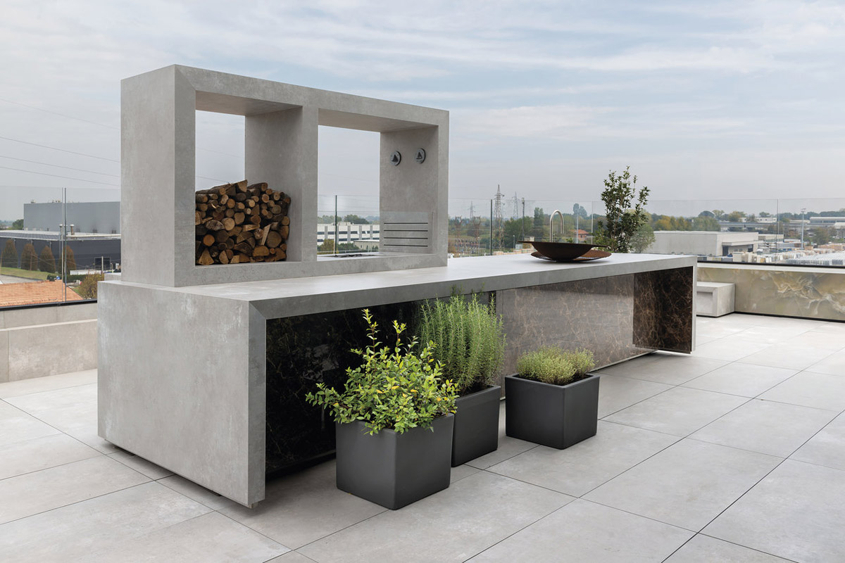The terrace, which completely surrounds The Attico, predominantly features concrete-effect MaxFine Walk-On in Silver on raised flooring, furnishings and an outdoor fireplace-pizza oven. Emperador and Onice Giada from the MaxFine collection accentuate the modular seating and layout in a perfect fusion of aesthetic style and functionality.