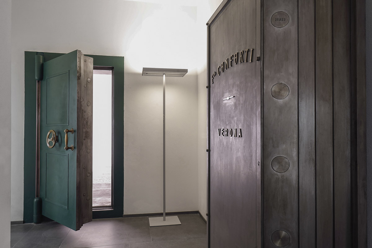 The second and third floors are for residential use (over 10 units available to rent), accessed from a private independent staircase leading from the adjacent piazza. The new APE museum (the name of the exhibition center), while emphasizing its preexisting banking history (armored doors and restored vaults), is a prime example of the cultural reuse of abandoned historical heritage for public benefit. The commission was to create an exhibition route in keeping with urban public spaces and the distinctive building.