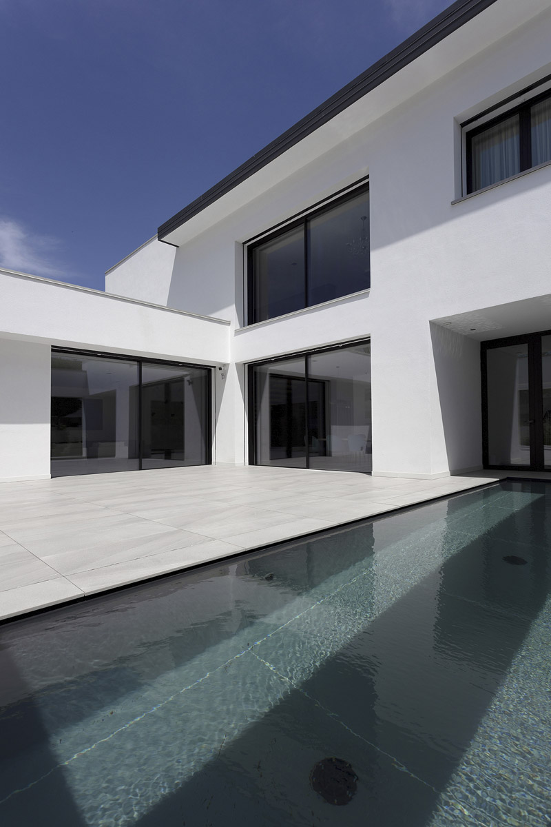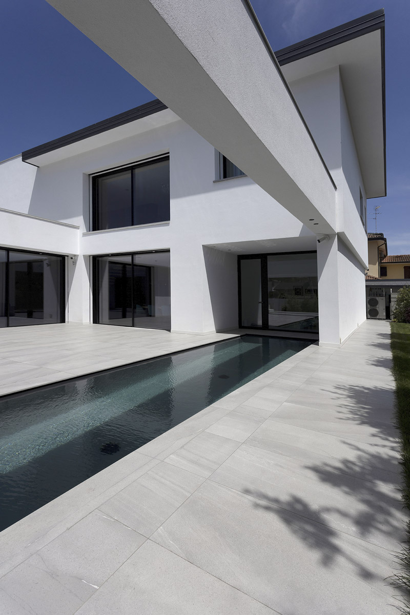This minimalist, executive home, features large windows that fill the rooms with natural light, while ensuring privacy from the surroundings. This was made possible by designing an ‘inverted’ structure where the absence of openings to the outside is made up for by large French windows that overlook the internal patio and the swimming pool. The result is a living space to be experienced from the inside, which clearly stands out from the surrounding buildings, particularly in terms of style.