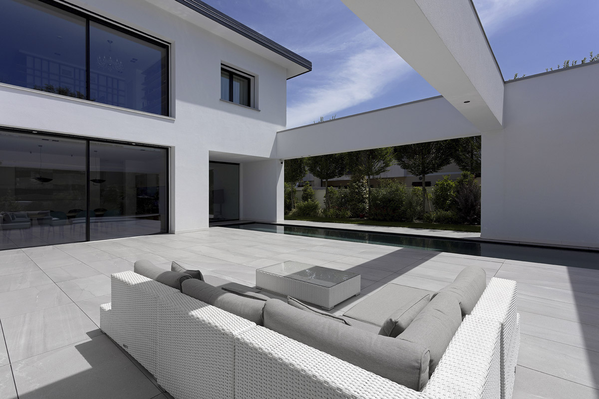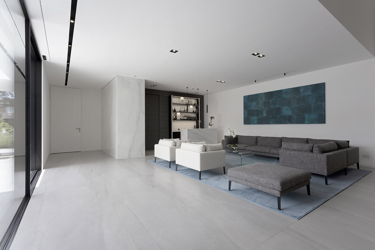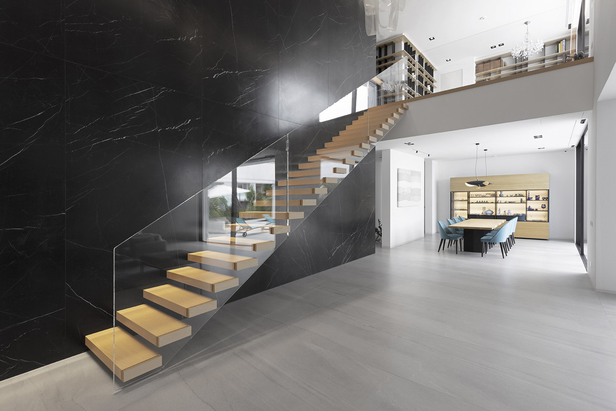 Marble and stone effects were selected, the best expression of which can be seen in the large format MaxFine ceramics. The bright and sophisticated whiteness of Marmi MaxFine Statuario Light 300×100 cm that welcomes you into the home is the star feature of the walls around the external covered atrium and the internal hallway. Providing a distinct color contrast, the two-storey area that unites the two floors of the building was enhanced by Marmi MaxFine Black Marquinia with a Silky finish in the 300×150 cm format: the intense black background of the marble creates a striking backdrop visible from the entrance of the villa and the entire living area, becoming its focal element. Neutral tones were chosen for the flooring, using Pietre MaxFine Lavica Grey 300×100 cm inside and Pietra di Basalto Grey by Iris Ceramica, in the 120×60 cm format – with slipperiness coefficient of R11 – on the patio, swimming pool area and side walkways.