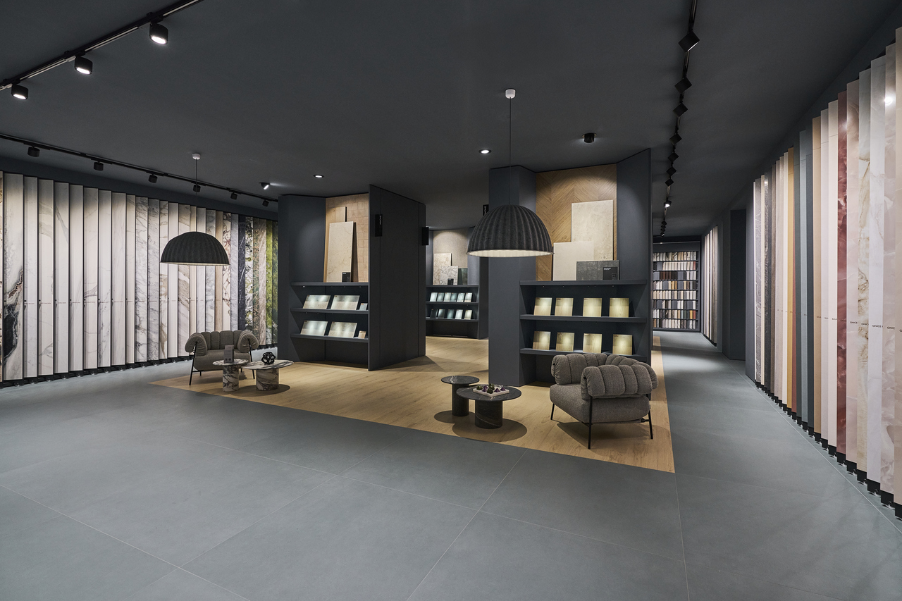 The FMG showroom is a place to explore, touch, and experience. Every detail is designed to highlight the power of ceramic material, through natural textures, sophisticated finishes, and immersive spaces meant to inspire.