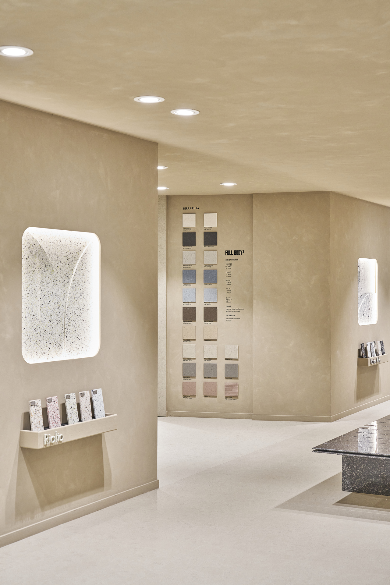 At the heart of the showroom is the expressive power of Full Body3, FMG’s proprietary technology that redefines technical ceramics: a full-body material, compact and homogeneous, where color, material, and pattern extend throughout the entire thickness of the slab. A single body, perfect for ensuring visual continuity and outstanding performance, even in the most demanding applications.